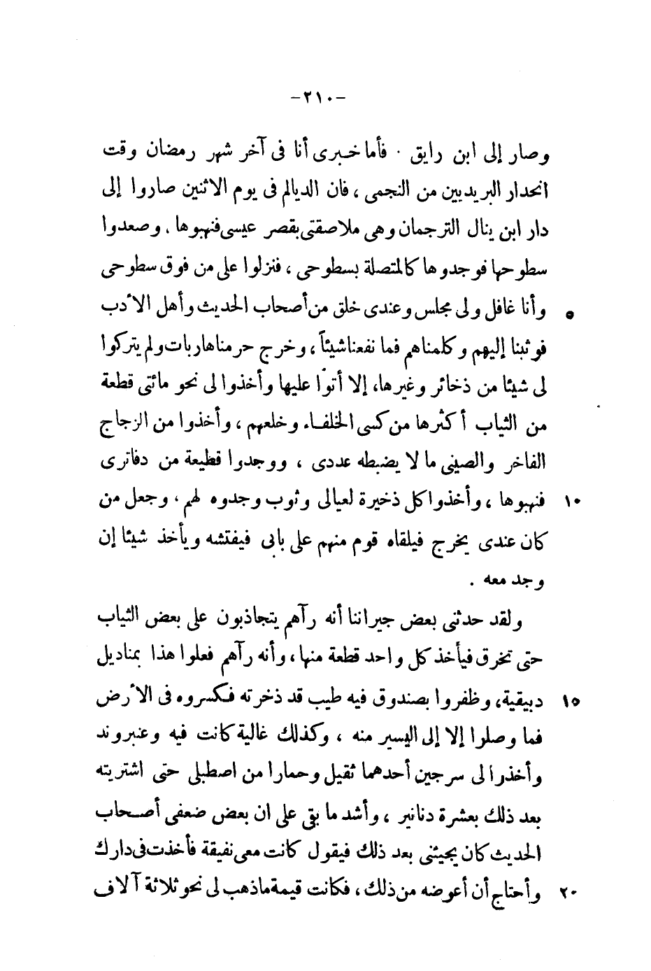 ولقد حدثني بعض جيراننا أنه رآهم يتجاذبون على بعض الثياب حتى تخرق فيأخذ كل واحد قطعة منها، وأنه رآهم فعلوا هذا بمناديل دبيقية، وظفروا بصندوق فيه طيب قد ذخرته فكسروه في الأرض فما وصلوا إلا إلى اليسير منه، وكذلك غالية كانت فيه وعنبروند وأخذوا لي سرجين أحدهما ثقيل وحماراً من اصطبلي حتى اشتريته بعد ذلك بعشرة دنانير، وأشد ما بقي على أن بعض ضعفى أصحاب الحديث كان يجيئني بعد ذلك فيقول كانت معي نفيقة فأخذت في دارك وأحتاج أن أعوضه من ذلك، فكانت قيمة ما ذهب لي نحو ثلاثة آلاف
