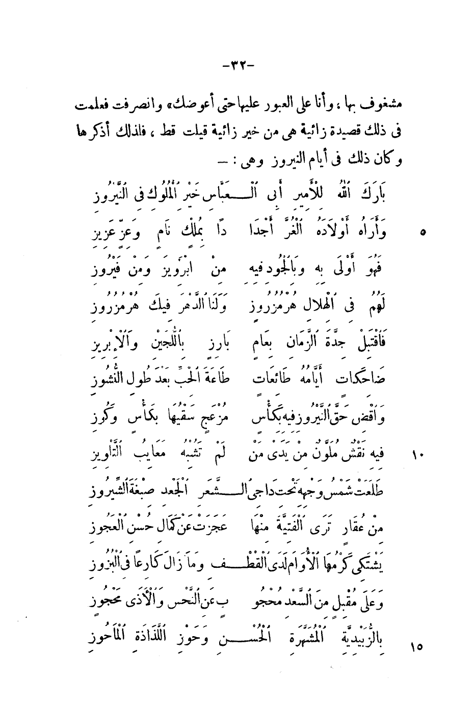 مشغوف بها، وأنا على العبور عليها حتى أَعوضك وانصرفت فعلمت في ذلك قصيدة زائية هي من خير زائية قيلت قط، فلذلك أذكرها وكان ذلك في أيام النيروز وهي: