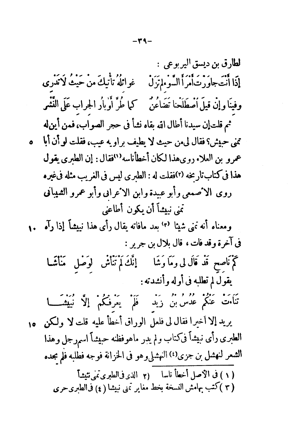 ثم قلت إن سيدنا أطال الله بقاه نشأ في حجر الصواب، فمن أي له تمنى حبيش؟ فقال لي من حيث لا يطيف براوية عيب، فقلت لو أن أبا عمرو بن العلاء روى هذه لكان أَخطأ ناسه فقال: إن الطبري يقول هذا في كتاب تاريخه فقلت له: الطبري ليس في الغريب مثله في غيره روى الأَصمعي وأبو عبيدة وابن الأعرابي وأبو عمرو الشيباني