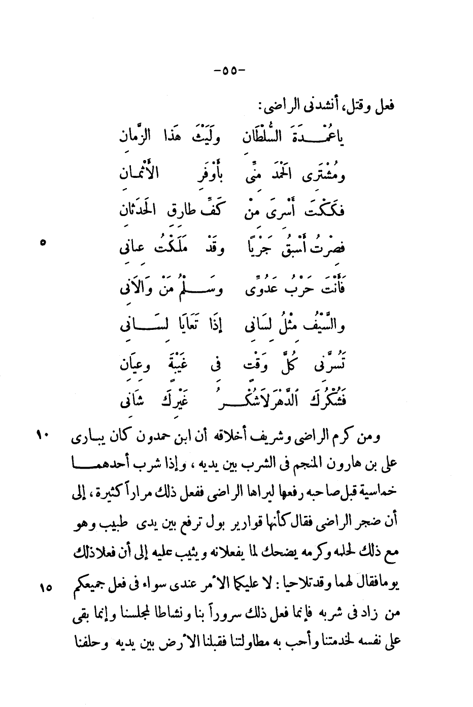ومن كرم الراضي وشريف أخلاقه أن ابن حمدون كان يباري علي بن هارون المنجم في الشرب بين يديه، وإذا شرب أحدهما خماسية قبل صاحبه رفعها ليراها الراضي ففعل ذلك مراراً كثيرة، إلى أن ضجر الراضي فقال كأنها قوارير بول ترفع بين يدي طبيب وهو مع ذلك لحلمه وكرمه يضحك لما يفعلانه ويثيب عليه إلى أن فعلا ذلك يوماً فقال لهما وقد تلاحيا: لا عليكما الأمر عندي سواء في فعل جميعكم من زاد في شربه فإنما فعل ذلك سروراً بنا ونشاطاً لمجلسنا وإنما بقي على نفسه لخدمتنا وأحب به مطاولتنا فقبلنا الأرض بين يديه وحلفنا