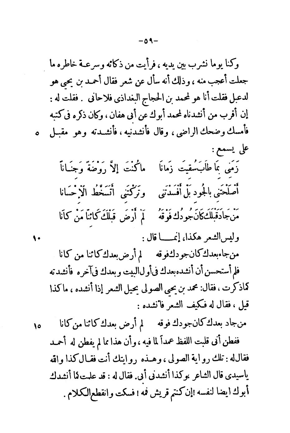 فلم استحسن أن أنشده بعدك في أول البيت وبعدك في آخره فأنشدته كما ذكرت، فقال: محمد بن يحيى الصولي يحيل الشعر إذا أنشده، ما كذا قيل، فقال له كيف الشعر فأنشده: