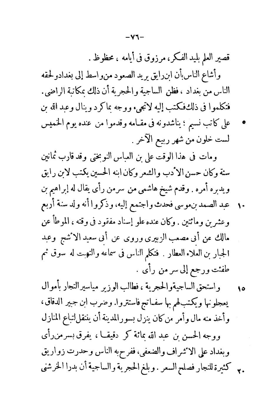 ومات في هذا الوقت علي بن العباس النوبختي وقد قارب ثمانين سنة وكان حسن الأدب والشعر وكان ابنه الحسين يكتب لابن رايق ويدبره أمره. وقد شيخ هاشمي من سر من رأى يقال له إبراهيم بن عبد الصمد بن موسى فحدث واجتمع إليه، وذكروا أنه ولد سنة أربع وعشرين ومائتين، وكان عنده علو إسناد مفقود في وقته، الموطأ عن مالك عن أبي مصعب الزبيري وروى عن أبي سعد الأشج وعبد الجبار بن العلاء العطار. فتكلم الناس في سماعة والتهبت له سوق ثم طفئت ورجع إلى سر من رأى.