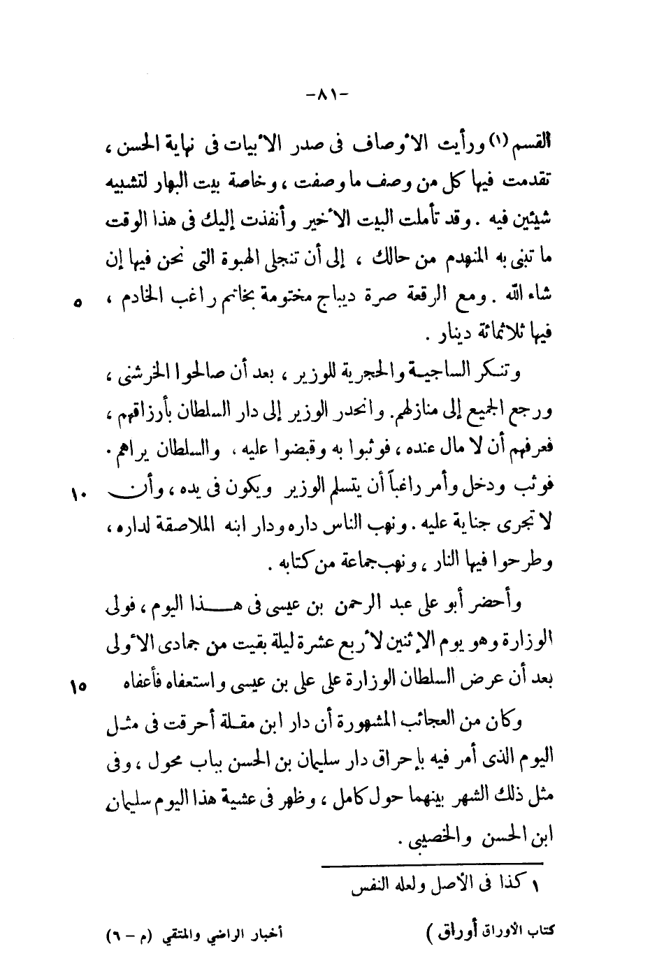 القسم ورأيت في صدر الأبيات في نهاية الحسن، تقدمت فيها كل من وصف ما وصفت، وخاصة بيت البهار لتشبيهه شيئين فيه. وقد تأملت البيت الأخير وأنفذت إليك في هذا الوقت ما تبنى به المنهدم من حالك، إلى أن تنجلي الهبوة التي نحن فيها إن شاء الله. ومع الرقعة صرة ديباج مختومة بخاتم راغب الخادم، فيها ثلاثمائة دينار.