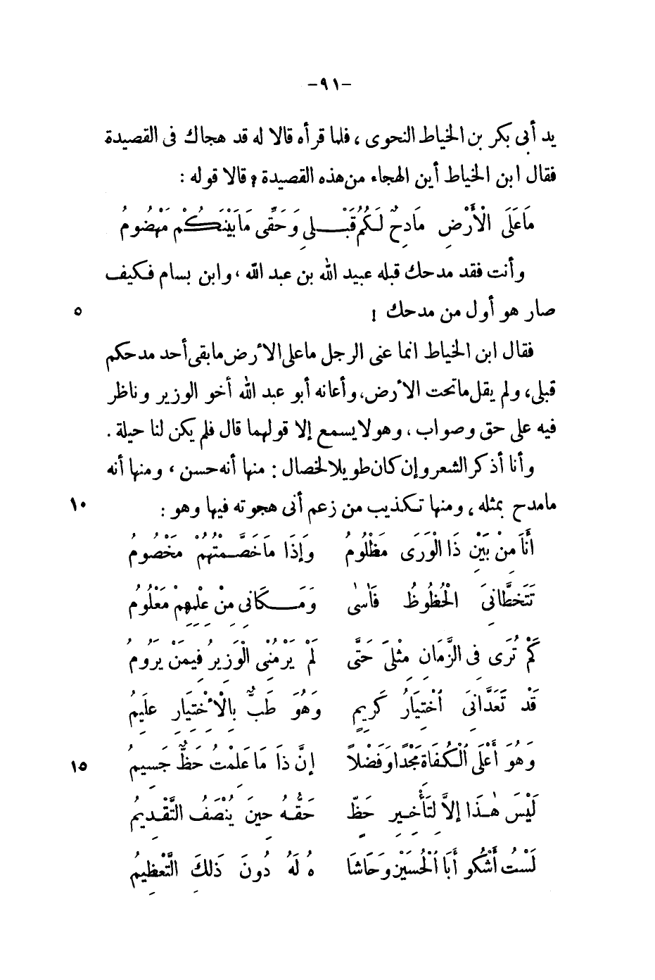 يد أبي بكر بن الخياط النحوي، فلما قرأه قالا له قد هجاك في القصيدة فقال ابن الخياط أين الهجاء من هذه القصيدة. قالا قوله: