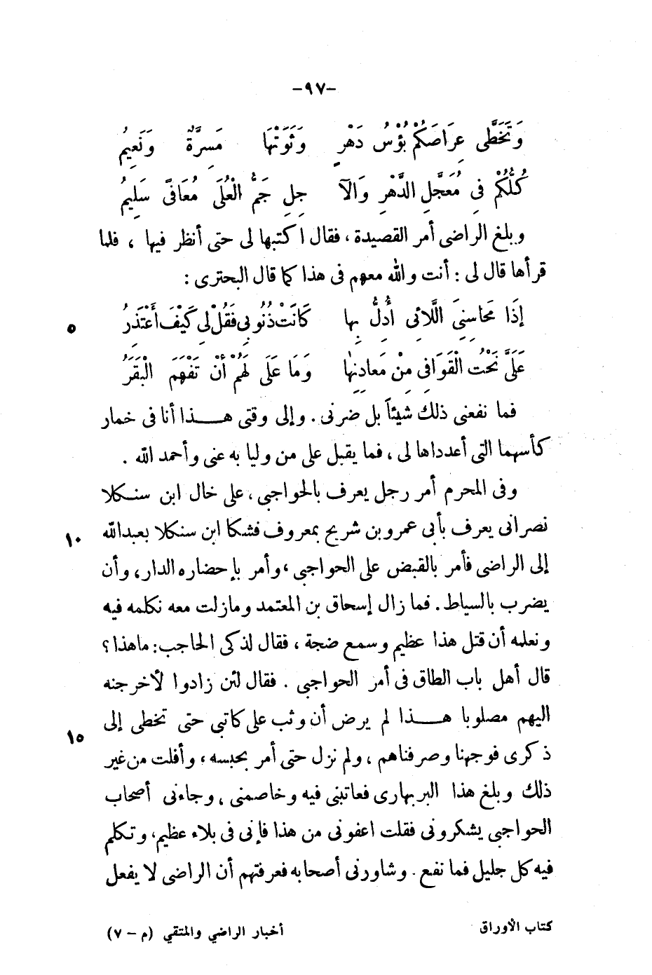 وبلغَ الراضي أمر القصيدة، فقال اكتبها لي حتى أنظر فيها، فلما قرأها قال لي: أنت والله معهم في هذا كما قال البحتري: