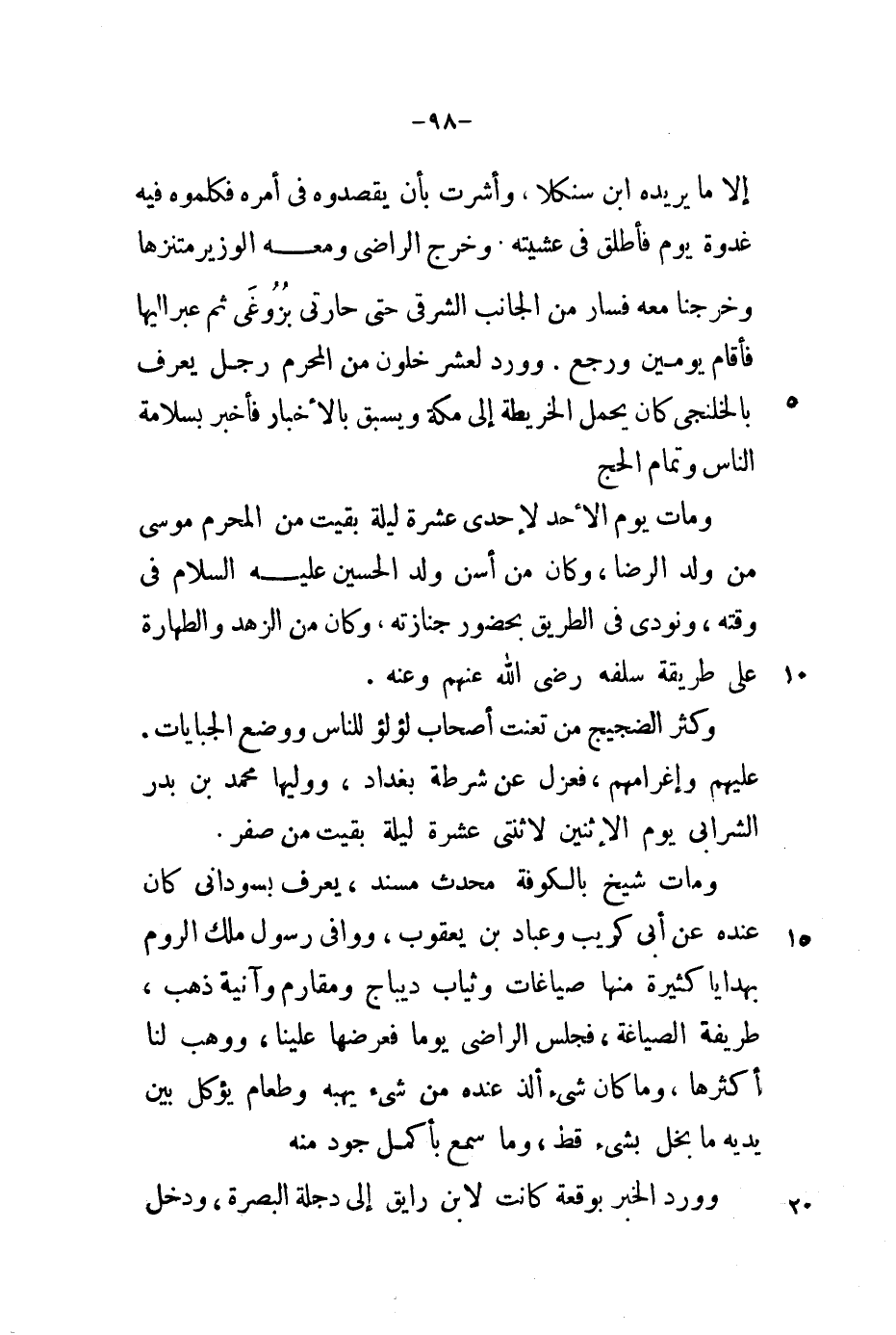 إلا ما يريده ابن سنكلا، وأشرت بأن يقصدوه في أمره فكلموه فيه غدوة يوم فأطلق في عشيته. وخرج الراضي معه الوزير متنزهاً وخرجنا معه فسار من الجانب الشرقي حتى حارتي بُزُوغَى ثم عبر إليها فأقام يومين ورجع. وورد لعشر خلون من المحرم رجل يعرف بالخلنجي كان يحمل الخريطة إلى مكة ويسبق بالأخبار فأخبر بسلامة الناس وتمام الحج.