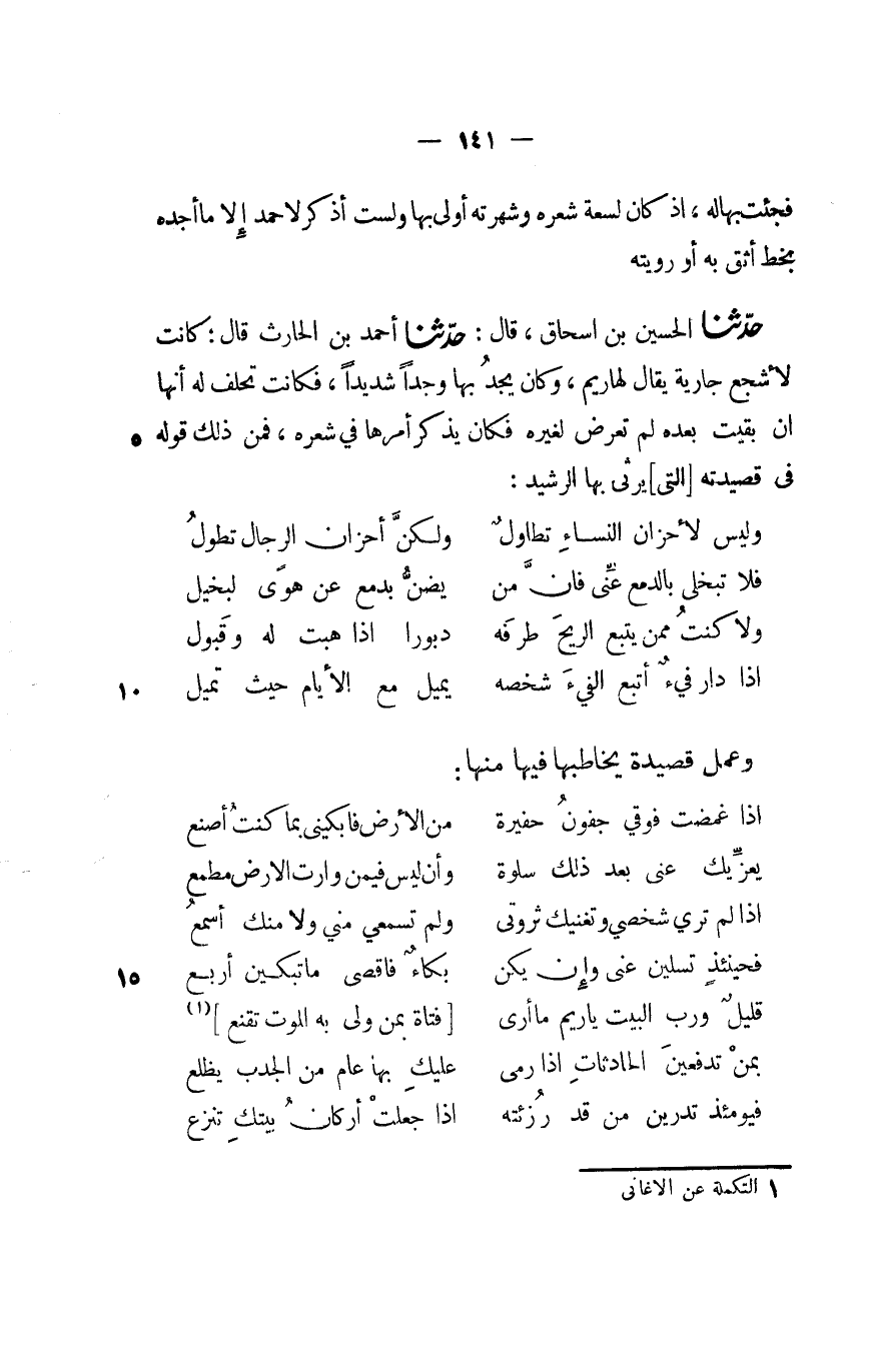 فجئت بها له، اذ كان لسعة شعره وشهرته أولى بها ولست أذكر لاحمد إلا ما أجده بخط أثق به أو رويته حدّثنا الحسين بن اسحاق، قال: حدّثنا أحمد بن الحارث قال: كانت لأشجع جارية يقال لهاريم، وكان يجد بها وجدا شديدا، فكانت تحلف له أنها ان بقيت بعده لم تعرض لغيره فكان يذكر أمرها في شعره، فمن ذلك قوله فى قصيدته [التى] يرثى بها الرشيد:
