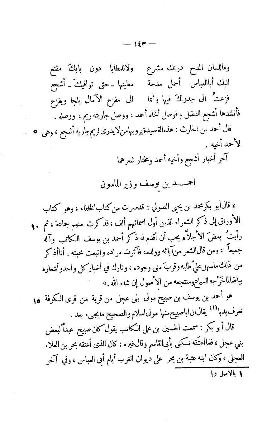 «قال أبو بكر محمد بن يحيى الصولي: قد صرت من كتاب الخلفاء، وهو كتاب الأوراق إلى ذكر الشعراء الذين أول اسمائهم ألف، فذكرت منهم جماعة، ثم رأيت بعض الأجلّاء يحب أن أقدم له ذكر أحمد بن يوسف الكاتب وآله جميعا، ومن قال الشعر من آبائه وولده، فآثرت مراده واتبعت محبته. أنا أذكر من ذلك ما سهل عليّ طلبه وقرب منى وجوده، وتارك في أخبار كل واحد وأشعاره بياضا لما خرجه السماع ومنتجعه من الأصول إن شاء الله.»