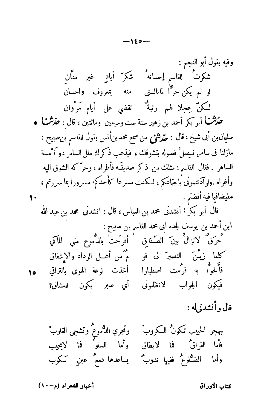 قال أبو بكر: أنشدنى محمد بن العباس، قال: انشدنى محمد بن عبد الله ابن أحمد بن يوسف لجده ابى محمد القاسم بن صبيح: