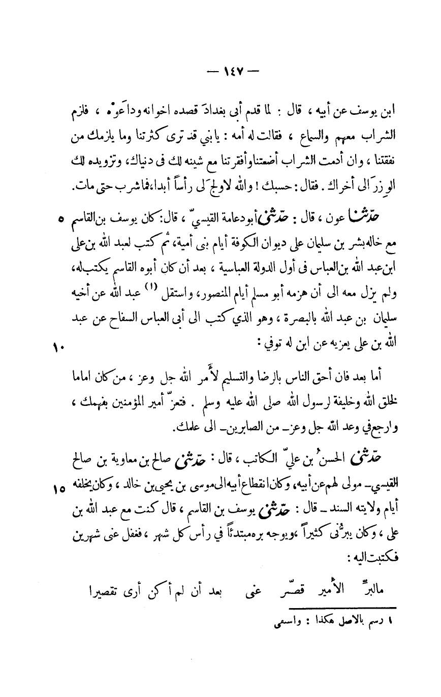 حدّثنا عون، قال: حدّثنى أبو دعامة القيسيّ، قال: كان يوسف بن القاسم مع خاله بشر بن سليمان على ديوان الكوفة أيام بنى أمية، ثم كتب لعبد الله بن على ابن عبد الله بن العباس فى أول الدولة العباسية، بعد أن كان أبوه القاسم يكتب له، ولم يزل معه الى أن هزمه أبو مسلم أيام المنصور، واستقل «1» عبد الله عن أخيه سليمان بن عبد الله بالبصرة، وهو الذي كتب الى أبى العباس السفاح عن عبد الله بن على يعزيه عن ابن له توفي: