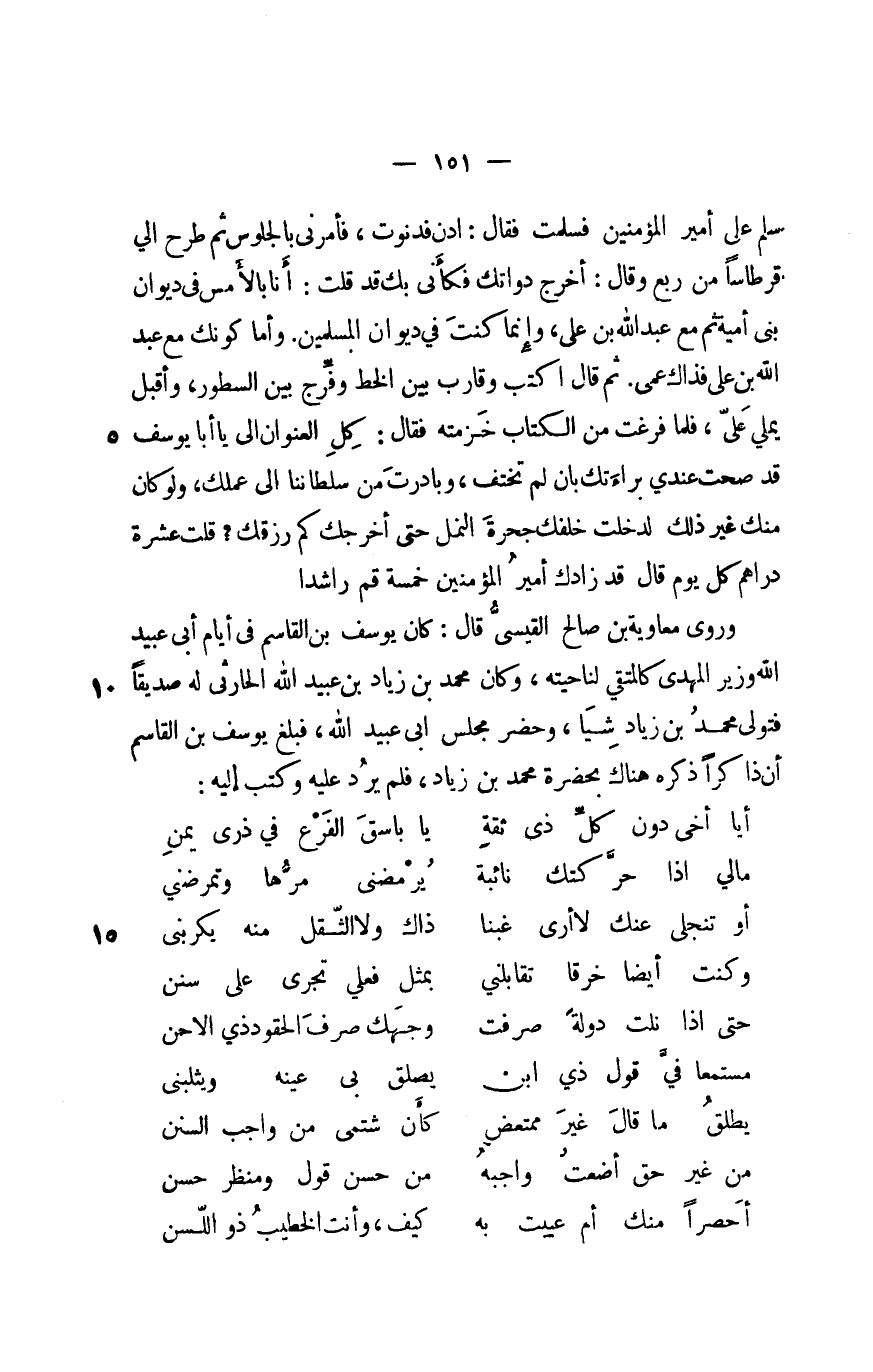 سلم على أمير المؤمنين فسلمت فقال: ادن فدنوت، فأمرنى بالجلوس ثم طرح الي قرطاسا من ربع وقال: أخرج دواتك فكأنى بك قد قلت: أنا بالأمس فى ديوان بنى أمية ثم مع عبد الله بن على، وإنما كنت في ديوان المسلمين. وأما كونك مع عبد الله بن على فذاك عمى. ثم قال اكتب وقارب بين الخط وفرّج بين السطور، وأقبل يملي علىّ، فلما فرغت من الكتاب خزمته فقال: كل العنوان الى يا أبا يوسف قد صحت عندي براءتك بان لم تختف، وبادرت من سلطاننا الى عملك، ولو كان منك غير ذلك لدخلت خلفك جحرة النمل حتى أخرجك كم رزقك؟ قلت عشرة دراهم كل يوم قال قد زادك أمير المؤمنين خمسة قم راشدا وروى معاوية بن صالح القيسىّ قال: كان يوسف بن القاسم فى أيام أبى عبيد الله وزير المهدى كالمتقي لناحيته، وكان محمد بن زياد بن عبيد الله الحارثى له صديقا فتولى محمد بن زياد شيا، وحضر مجلس ابى عبيد الله، فبلغ يوسف بن القاسم أن ذاكرا ذكره هناك بحضرة محمد بن زياد، فلم يرد عليه وكتب إليه: