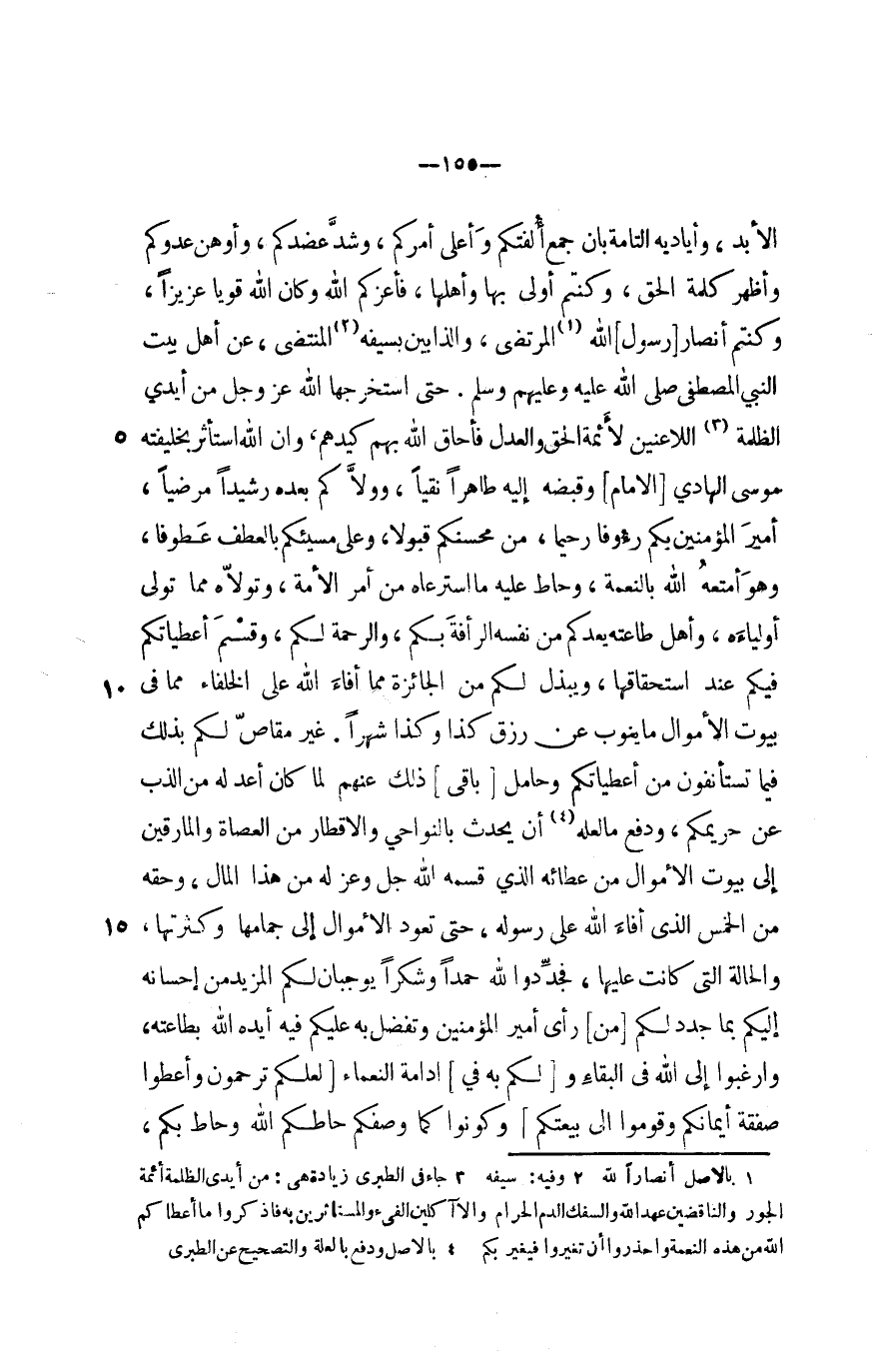 الأبد، وأياديه التامة بان جمع ألفتكم وأعلى أمركم، وشدّ عضدكم، وأو هن عدوكم وأظهر كلمة الحق، وكنتم أولى بها وأهلها، فأعزكم الله وكان الله قويا عزيزا، وكنتم أنصار [رسول] الله «1» المرتضى، والذابين بسيفه «2» المنتضى، عن أهل بيت النبي المصطفى صلى الله عليه وعليهم وسلم. حتى استخرجها الله عز وجل من أيدي الظلمة «3» اللاعنين لأئمة الحق والعدل فأحاق الله بهم كيدهم، وان الله استأثر بخليفته موسى الهادي [الامام] وقبضه إليه طاهرا نقيا، وولّا كم بعده رشيدا مرضيا، أمير المؤمنين بكم رءوفا رحيما، من محسنكم قبولا، وعلى مسيئكم بالعطف عطوفا، وهو أمتعه الله بالنعمة، وحاط عليه ما استرعاه من أمر الأمة، وتولّاه مما تولى أولياءه، وأهل طاعته يعدكم من نفسه الرأفة بكم، والرحمة لكم، وقسم أعطياتكم فيكم عند استحقاقها، ويبذل لكم من الجائزة مما أفاء الله على الخلفاء مما فى بيوت الأموال ما يغوب عن رزق كذا وكذا شهرا. غير مقاصّ لكم بذلك فيما تستأنفون من أعطياتكم وحامل [باقى] ذلك عنهم لما كان أعد له من الذب عن حريمكم، ودفع مالعله «4» أن يحدث بالنواحي والاقطار من العصاة والمارقين إلى بيوت الأموال من عطائه الذي قسمه الله جل وعزله من هذا المال، وحقه من الخمس الذى أفاء الله على رسوله، حتى تعود الأموال إلى جمامها وكثرتها، والحالة التى كانت عليها، فجدّد والله حمدا وشكرا يوجبان لكم المزيد من إحسانه إليكم بما جدد لكم [من] رأى أمير المؤمنين وتفضل به عليكم فيه أيده الله بطاعته، وارغبوا إلى الله فى البقاء و [لكم به في] ادامة النعماء [لعلكم ترحمون وأعطوا صفقة أيمانكم وقوموا الى بيعتكم] وكونوا كما وصفكم حاطكم الله وحاط بكم،