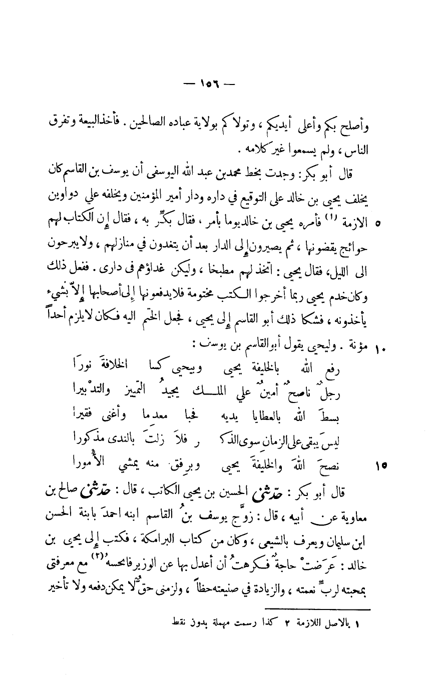 قال أبو بكر: حدّثنى الحسين بن يحيى الكاتب، قال: حدّثنى صالح بن معاوية عن أبيه، قال: زوّج يوسف بن القاسم ابنه احمد بابنة الحسن ابن سليمان ويعرف بالشيعى، وكان من كتاب البرامكة، فكتب إلى يحيى بن خالد: عرضت حاجة فكرهت أن أعدل بها عن الوزير فاحسه؟؟؟ «2» مع معرفتى بمحبته لربّ نعمته، والزيادة في صنيعته حظا، ولزمنى حقّ لا يمكن دفعه ولا تأخير