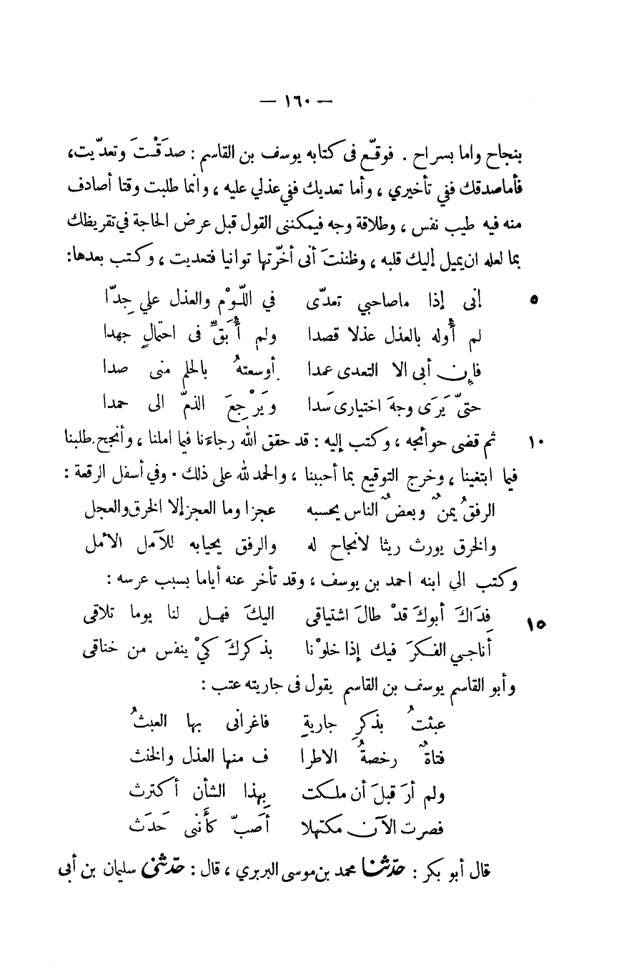 بنجاح واما بسراح. فوقّع فى كتابه يوسف بن القاسم: صدقت وتعدّيت، فأما صدقك ففي تأخيري، وأما تعديك ففي عذلي عليه، وانما طلبت وقتا أصادف منه فيه طيب نفس، وطلاقة وجه فيمكننى القول قبل عرض الحاجة في تقريظك بما لعله ان يميل إليك قلبه، وظننت أنى أخّرتها توانيا فتعديت، وكتب بعدها: