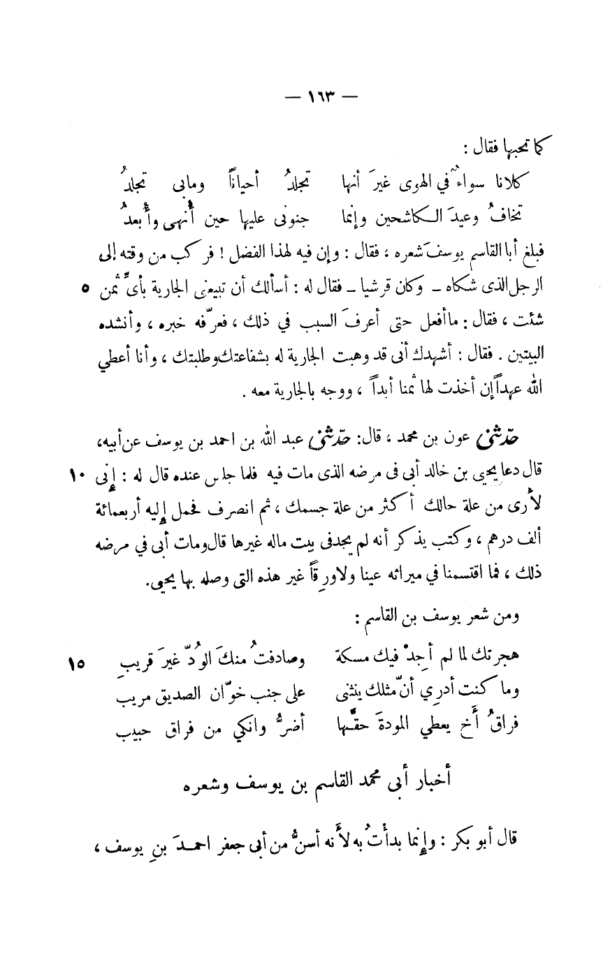 فبلغ أبا القاسم يوسف شعره، فقال: وإن فيه لهذا الفضل! فركب من وقته إلى الرجل الذى شكاه- وكان قرشيا- فقال له: أسألك أن تبيعنى الجارية بأىّ ثمن شئت، فقال: ما أفعل حتى أعرف السبب في ذلك، فعرّفه خبره، وأنشده البيتين. فقال: أشهدك أنى قد وهبت الجارية له بشفاعتك وطلبتك، وأنا أعطي الله عهدا إن أخذت لها ثمنا أبدا، ووجه بالجارية معه.