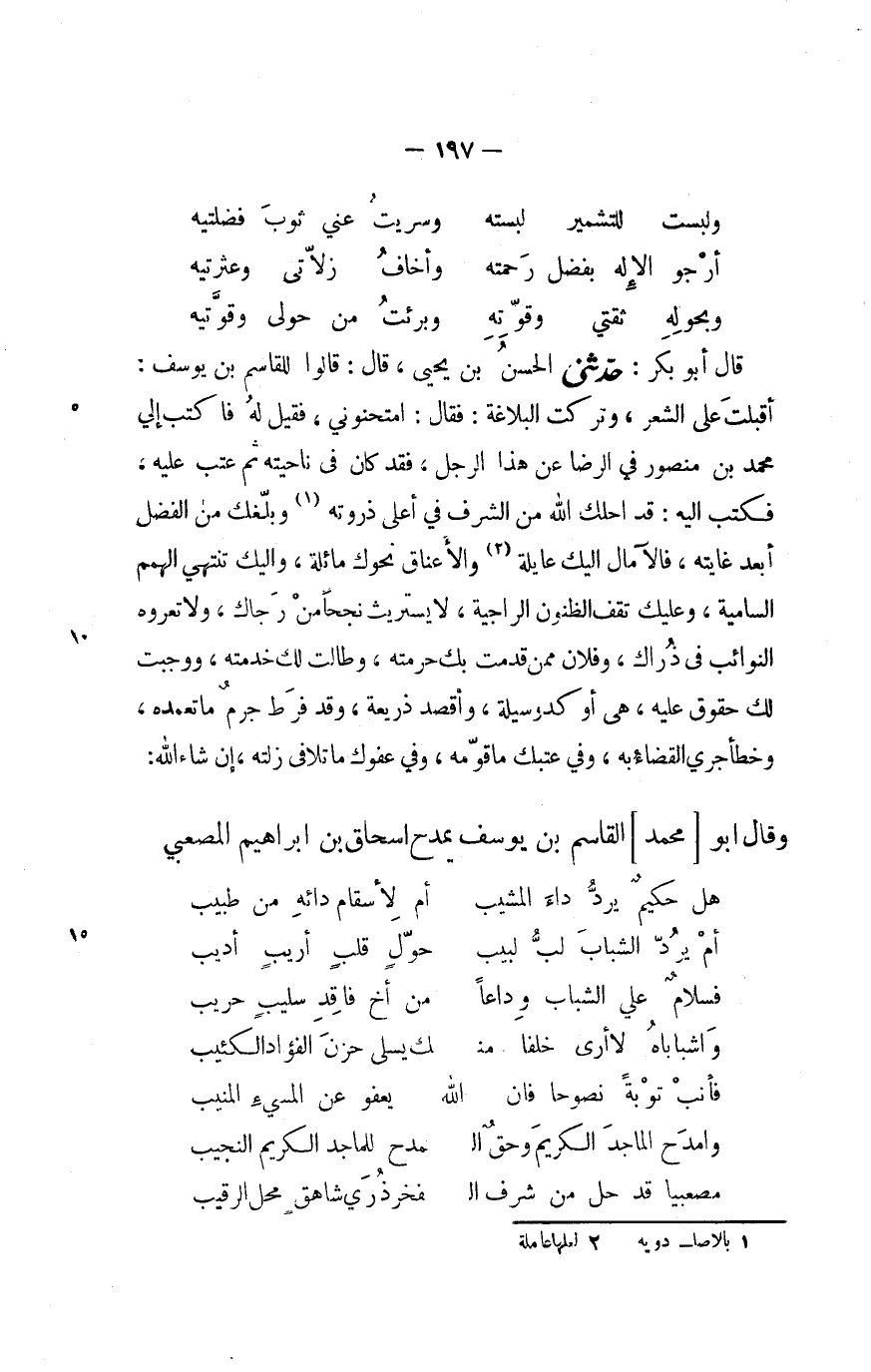وقال ابو [محمد] القاسم بن يوسف يمدح اسحاق بن ابراهيم المصعبي