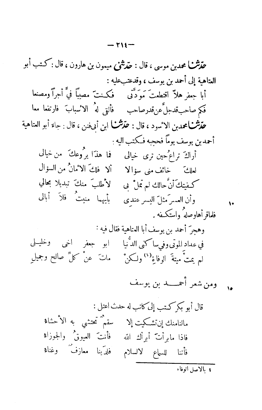 حدّثنا محمد بن الأسود، قال: حدّثنا ابن أبى فنن، قال: جاء أبو العتاهية أحمد بن يوسف يوما فحجبه فكتب اليه: