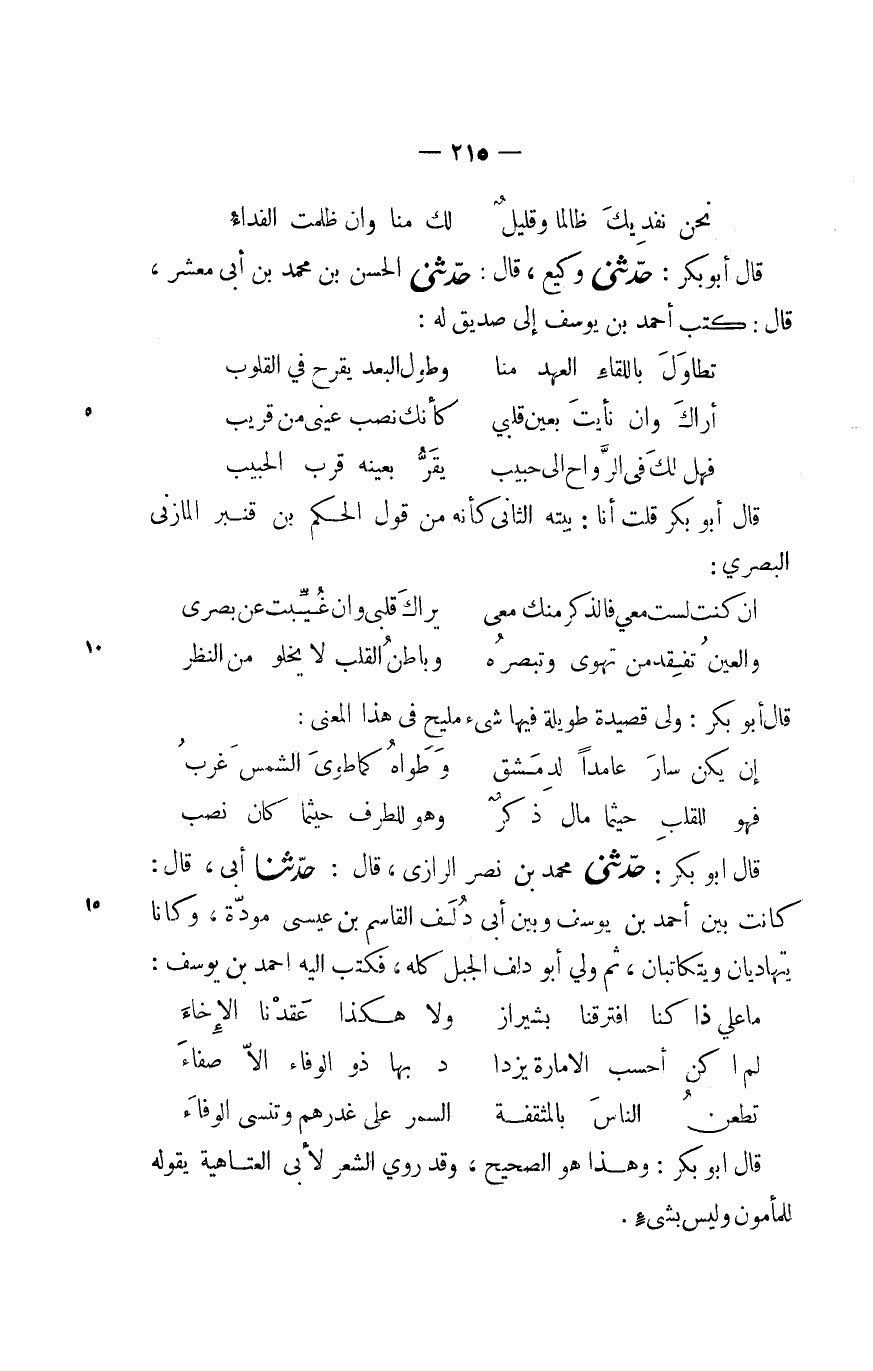 قال أبو بكر: حدّثنى وكيع، قال: حدّثنى الحسن بن محمد بن أبى معشر، قال: كتب أحمد بن يوسف إلى صديق له: