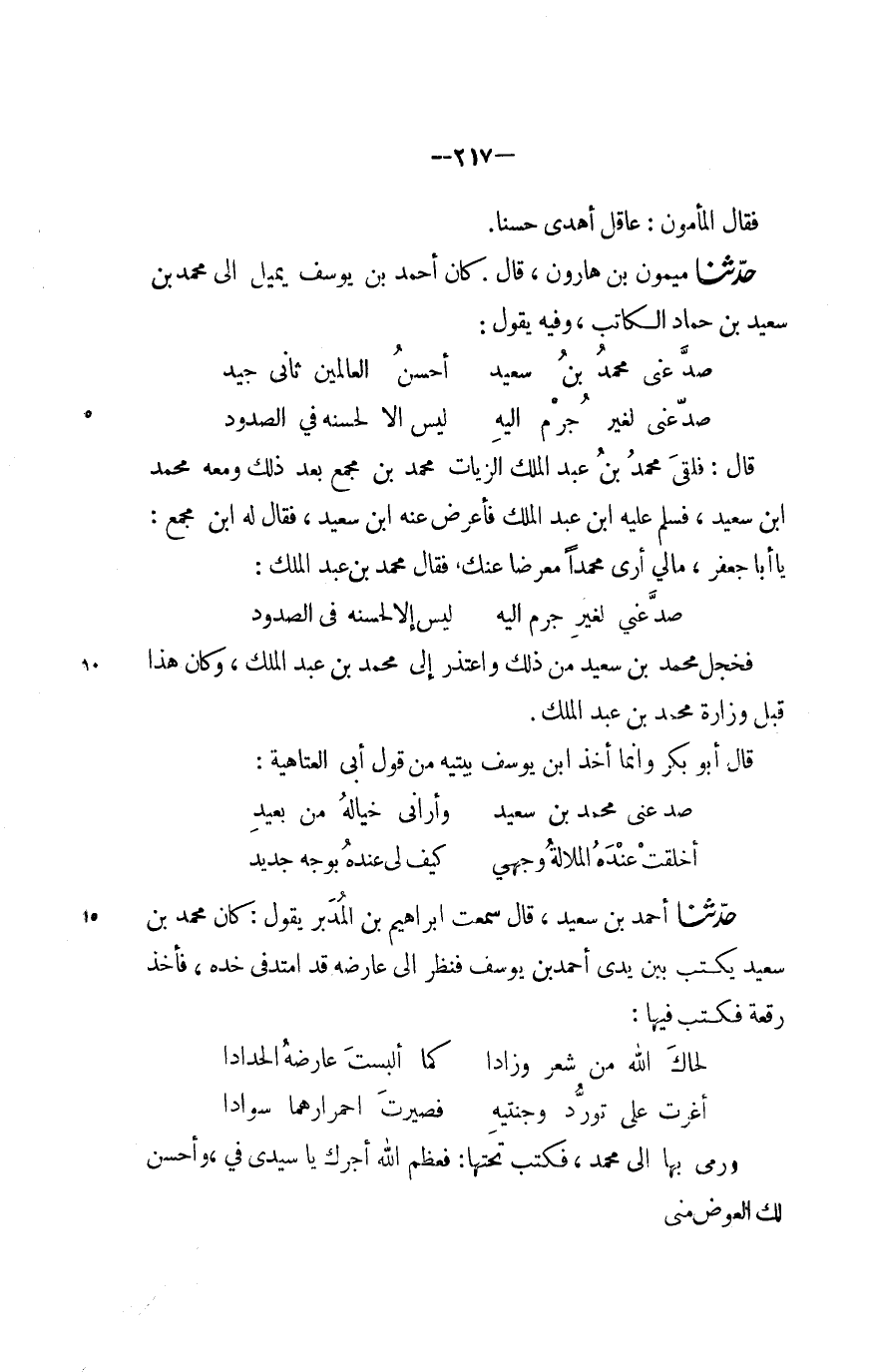 حدّثنا ميمون بن هارون، قال. كان أحمد بن يوسف يميل الى محمد بن سعيد بن حماد الكاتب، وفيه يقول: