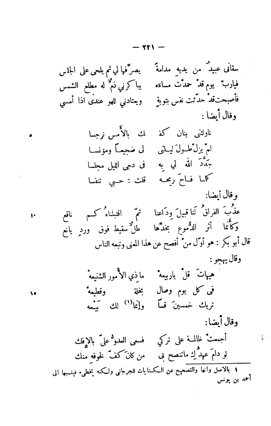 قال أبو بكر: هو أوّل من أفصح عن هذا المعنى وتبعه الناس وقال يهجو: