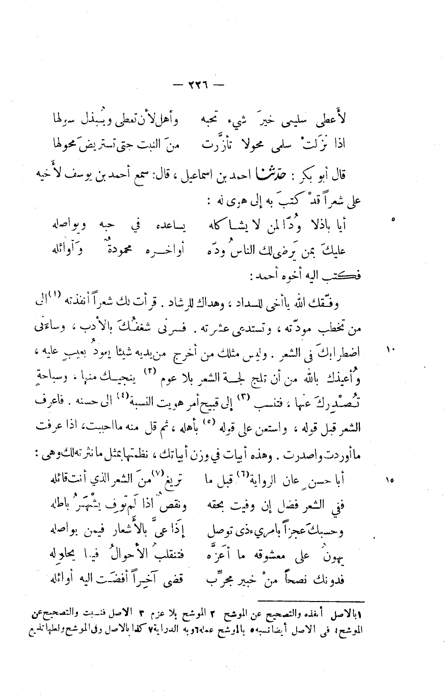 وفّقك الله يا أخى للسداد، وهداك للرشاد. قرأت لك شعرا أنفذته «1» الى من تخطب مودّته، وتستدعى عشرته. فسرنى شغفك بالأدب، وساءنى اضطرابك فى الشعر. وليس مثلك من أخرج من يديه شيئا يعود بعيب عليه، وأعيذك بالله من أن تلج لجة الشعر بلا عوم «2» ينجيك منها، وسباحة تصدرك عنها، فتنسب «3» إلى قبيح أمر هويت النسبة «4» الى حسنه. فاعرف الشعر قبل قوله، واستعن على قوله «5» بأهله، ثم قل منه ما احببت، اذا عرفت ما أوردت واصدرت. وهذه أبيات في وزن أبياتك، نظمتها بمثل ما نثرته لك وهى: