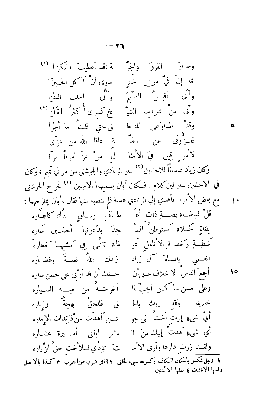 وكان زياد صديقا للاحشين «3» سار الزنادي والجوشنى من موالي تميم، وكان في الاحشين سار لين كلام. فكان أبان يسميهما الاجتين «4» فحرج الجوشنى مع بعض الأمراء فأهدي إلي الزنادي هدية فلم ينصبه منها فقال، أبان يمازحهما: