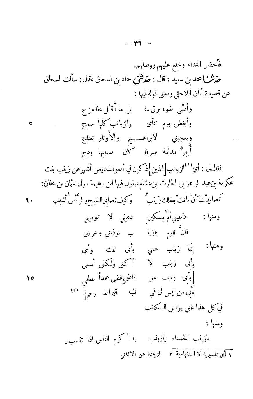 فقال لى: أي «1» الزيانب [الذين] ذكرن في أصوات، ومن أشهر هن زينب بنت عكرمة بن عبد الرحمن بن الحارث بن هشام، يقول فيها ابن رهيمة مولى عثمان بن عفان: