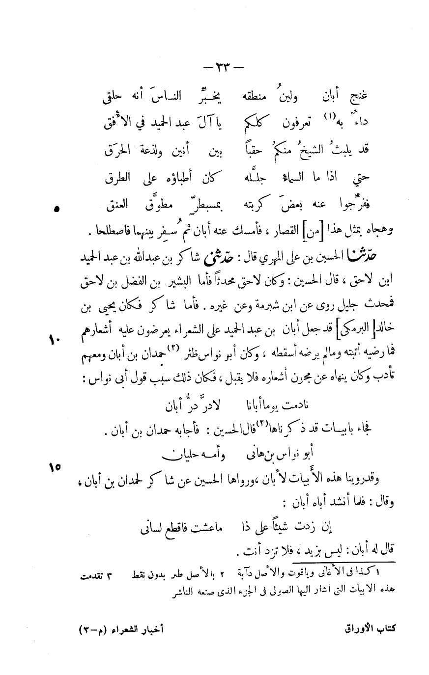 حدّثنا الحسين بن على المهري قال: حدّثنى شاكر بن عبد الله بن عبد الحميد ابن لاحق، قال الحسين: وكان لاحق محدثا فأما البشير بن الفضل بن لاحق فمحدث جليل روى عن ابن شبرمة وعن غيره. فأما شاكر فكان يحيى بن خالد [البرمكى] قد جعل أبان بن عبد الحميد على الشعراء يعرضون عليه أشعارهم فما رضيه أثبته ومالم يرضه أسقطه، وكان أبو نواس ظئر «2» حمدان بن أبان ومعهم تأدب وكان ينهاه عن مجون أشعاره فلا يقبل، فكان ذلك سبب قول أبى نواس: