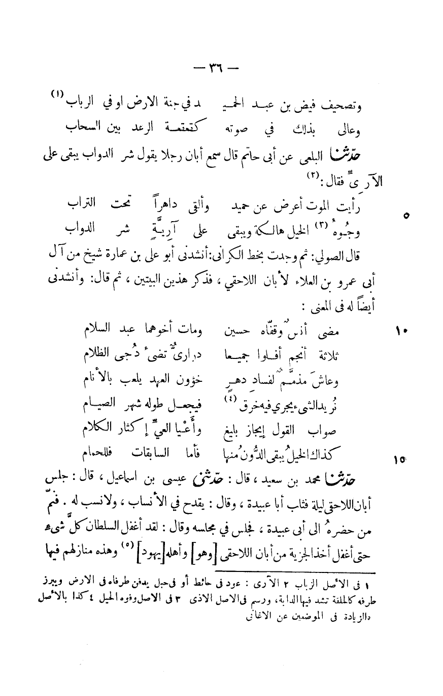حدثنا محمد بن سعيد، قال: حدثنى عيسى بن اسماعيل، قال: جلس أبان اللاحقى ليلة فثلب أبا عبيدة، وقال: يقدح في الأنساب، ولا نسب له. فنمّ من حضره الى أبى عبيدة، فجلس في مجلسه وقال: لقد أغفل السلطان كلّ شىء حتى أغفل أخذ الجزية من أبان اللاحقى [وهو] وأهله [يهود] «5» وهذه منازلهم فيها