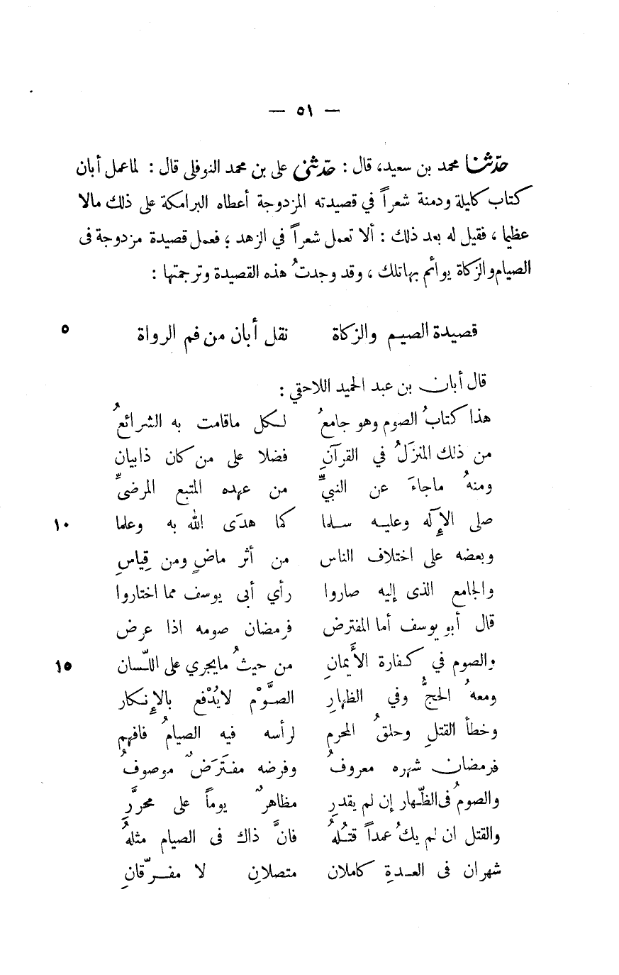 حدّثنا محمد بن سعيد، قال: حدّثنى على بن محمد النوفلى قال: لما عمل أبان كتاب كليلة ودمنة شعرا في قصيدته المزدوجة أعطاه البرامكة على ذلك مالا عظيما، فقيل له بعد ذلك: ألا تعمل شعرا في الزهد؛ فعمل قصيدة مزدوجة فى الصيام والزكاة يوائم بها تلك، وقد وجدت هذه القصيدة وترجمتها: