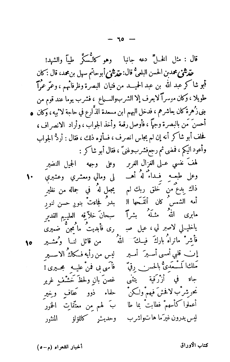 حدّثنى محمد بن الحسن البلعىّ قال: حدّثنى أبو حاتم سهل بن محمد، قال: كان أبو شاكر عبد الله بن عبد الحميد من فتيان البصرة وظرفائهم، وعمّر عمرا طويلا، وكان موسرا لا يعرف إلا الشرب والسماع، فشرب يوما عند قوم من بنى زهرة كان يعاشرهم، فدخل اليهم ابن مسعدة الذّارع في حاجة لأبيه، وكان أحسن من بالبصرة وجها، فأوصل رقعة وأخذ الجواب، وأراد الانصراف، فحلف أبو شاكر أنه إن لم يجلس انصرف، فسألوه ذلك، فقال: أردّ الجواب وأعود اليكم، فمضى ثم رجع فشرب وغنىّ، فقال أبو شاكر: