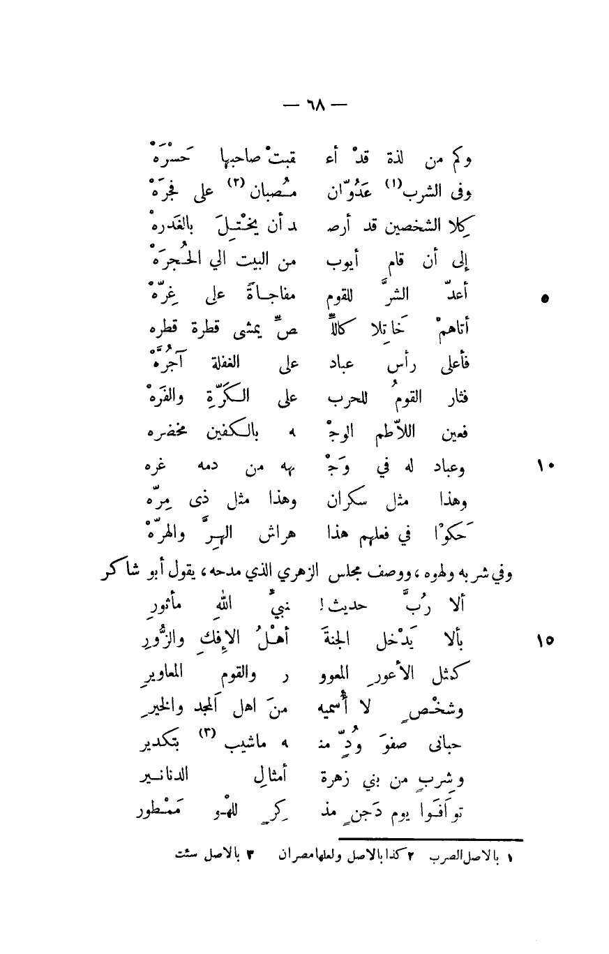 وفي شربه ولهوه، ووصف مجلس الزهري الذي مدحه، يقول أبو شاكر
