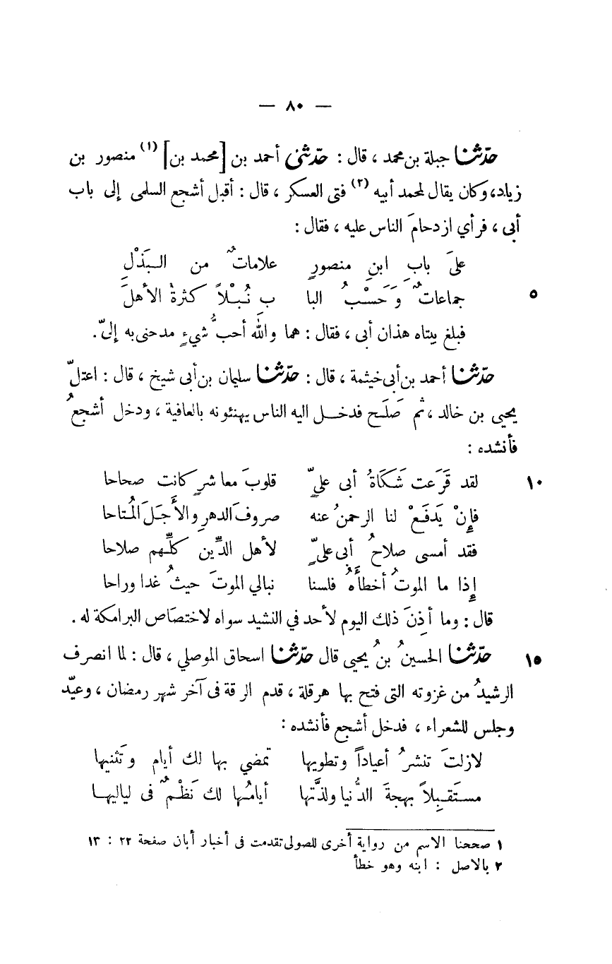 حدّثنا الحسين بن يحيى قال حدّثنا اسحاق الموصلي، قال: لما انصرف الرشيد من غزوته التى فتح بها هرقلة، قدم الرقة فى آخر شهر رمضان، وعيّد وجلس للشعراء، فدخل أشجع فأنشده: