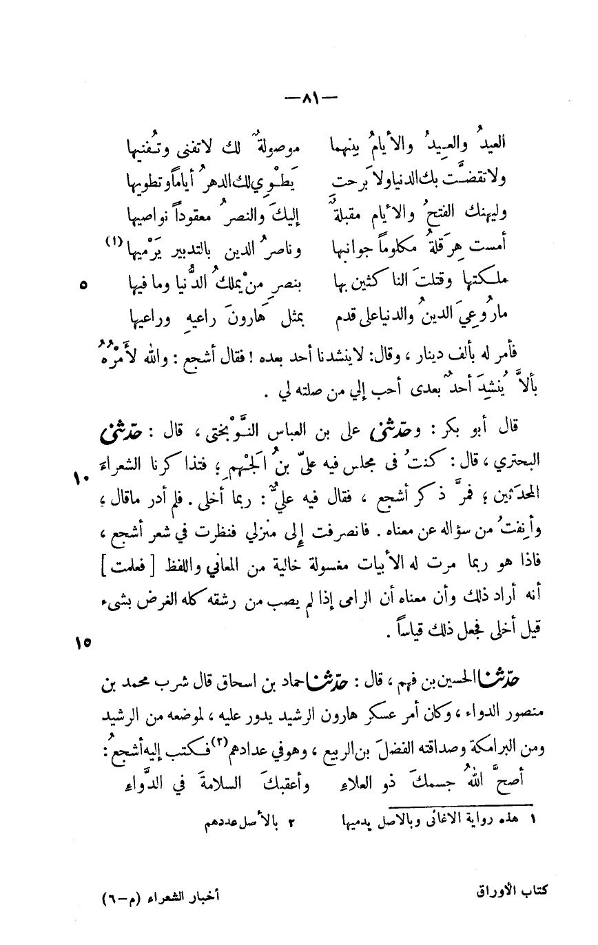 قال أبو بكر: وحدّثنى على بن العباس النّوبختى، قال: حدّثنى البحتري، قال: كنت فى مجلس فيه علىّ بن الجهم؛ فتذاكرنا الشعراء المحدثين؛ فمرّ ذكر أشجع، فقال فيه عليّ: ربما أخلى. فلم أدر ما قال؛ وأنفت من سؤاله عن معناه. فانصرفت إلى منزلي فنظرت في شعر أشجع، فاذا هو ربما مرت له الأبيات مغسولة خالية من المعاني واللفظ [فعلمت] أنه أراد ذلك وأن معناه أن الرامى إذا لم يصب من رشقه كله الغرض بشىء قيل أخلى فجعل ذلك قياسا.