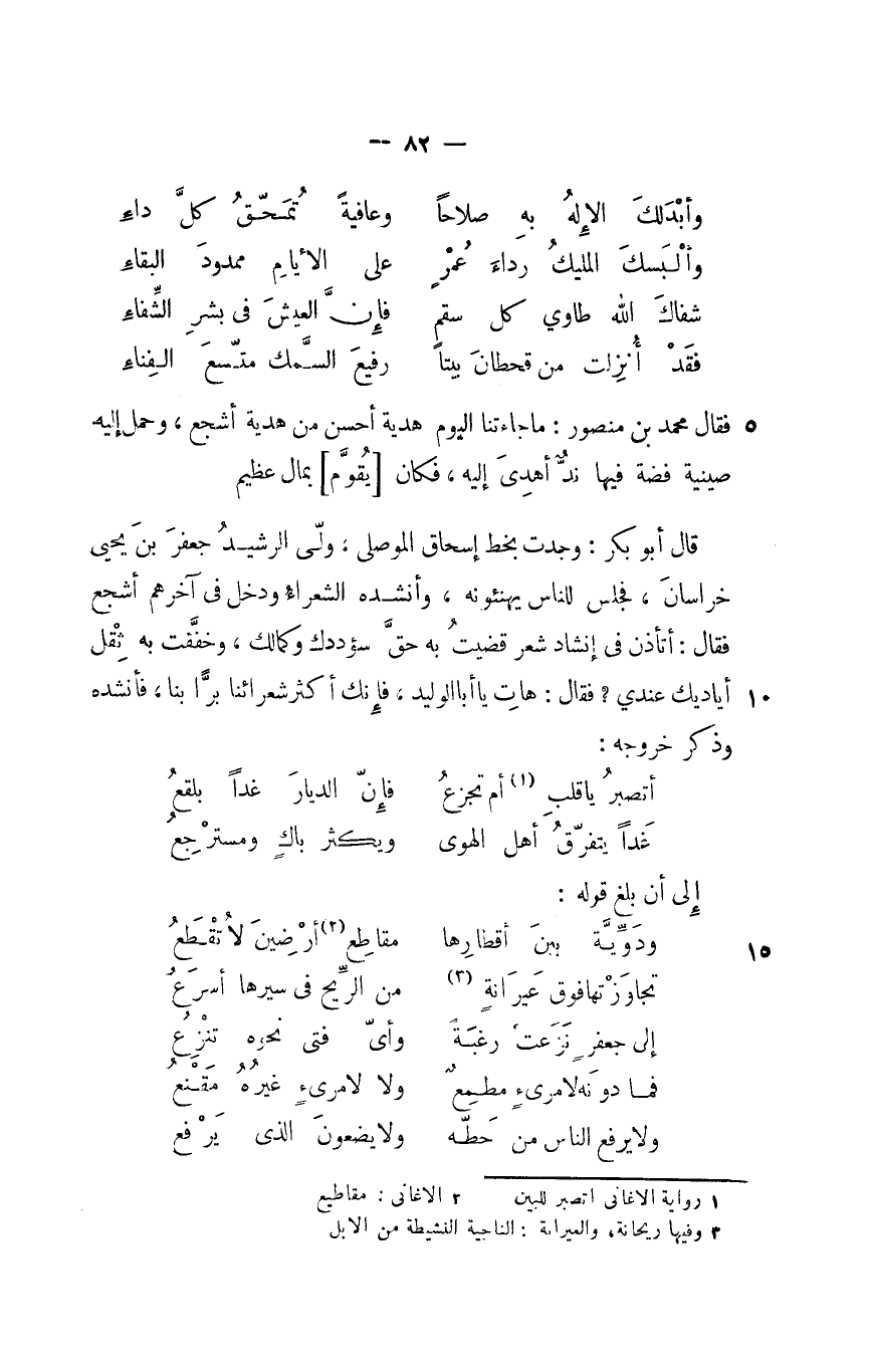 فقال محمد بن منصور: ما جاءتنا اليوم هدية أحسن من هدية أشجع، وحمل إليه صينية فضة فيها ندّ أهدى إليه، فكان [يقوّم] بمال عظيم قال أبو بكر: وجدت بخط إسحاق الموصلى: ولّى الرشيد جعفر بن يحيى خراسان، فجلس للناس يهنئونه، وأنشده الشعراء ودخل فى آخرهم أشجع فقال: أتأذن فى إنشاد شعر قضيت به حقّ سؤددك وكمالك، وخفّفت به ثقل أياديك عندي؟ فقال: هات يا أبا الوليد، فإنك أكثر شعرائنا برّا بنا، فأنشده وذكر خروجه: