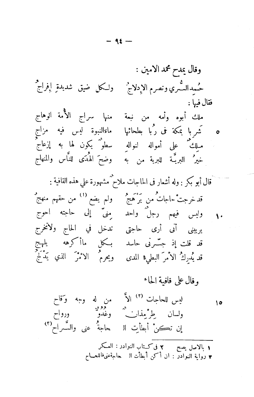 قال أبو بكر: وله أشعار فى الحاجات ملاح مشهورة علي هذه القافية: