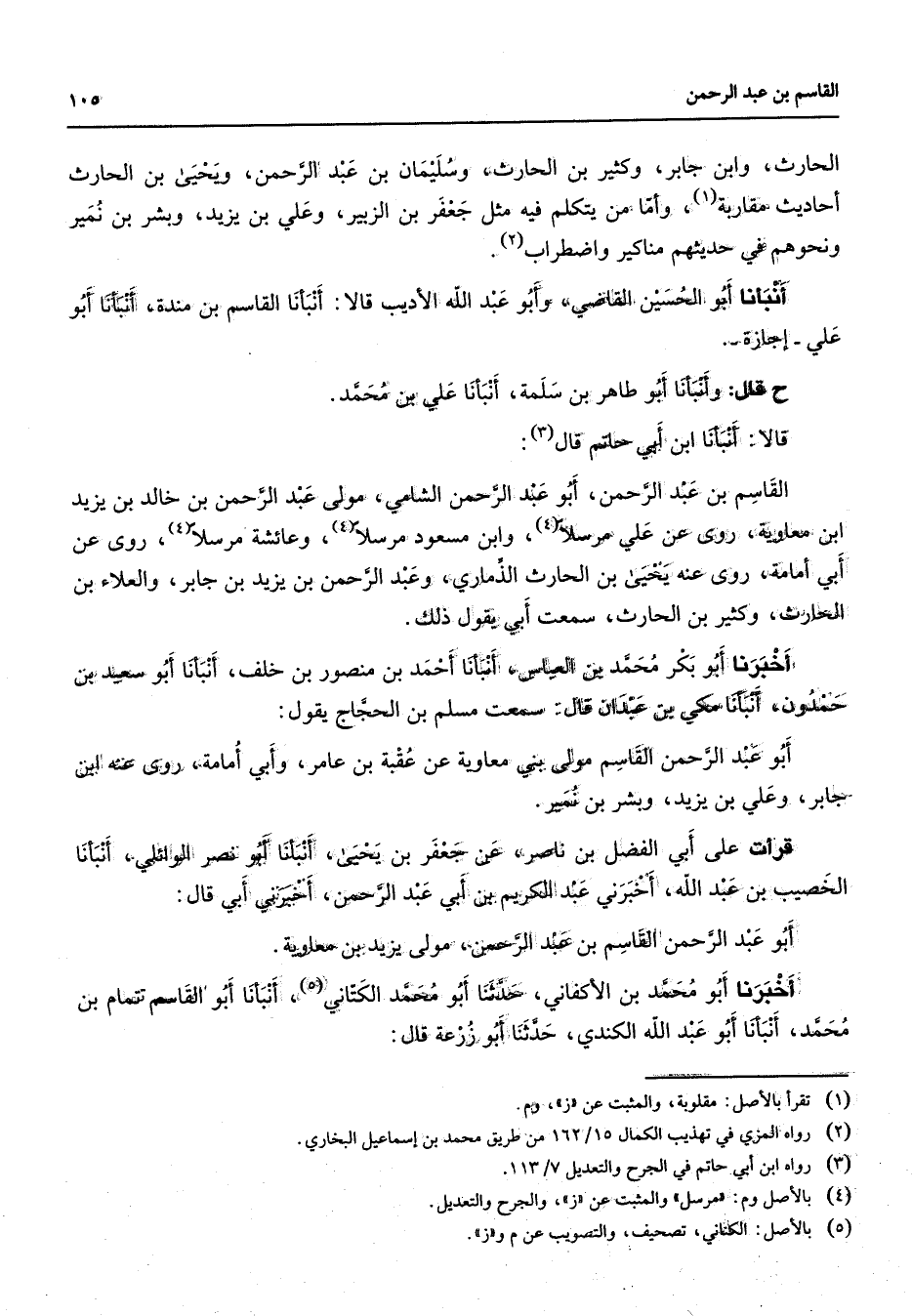 الحارث وابن جابر وكثير بن الحارث وسليمان بن عبد الرحمن ويحيى بن الحارث أحاديث مقاربة (1) وأما من يتكلم فيه مثل جعفر بن الزبير وعلي بن يزيد وبشر بن نمير ونحوهم في حديثهم مناكير واضطراب (2) أنبأنا أبو الحسين القاضي وأبو عبد الله الأديب قالا أنبأنا القاسم بن مندة أنبأنا أبو علي إجازة قال وأنبأنا أبو طاهر بن سلمة أنبأنا علي بن محمد قالا أنبأنا ابن أبي حاتم قال (3) القاسم بن عبد الرحمن أبو عبد الرحمن الشامي مولى عبد الرحمن بن خالد بن يزيد ابن معاوية روى عن علي مرسلا (4) وابن مسعود مرسلا (4) وعائشة مرسلا (4) روى عن أبي أمامة روى عنه يحيى بن الحارث الذماري وعبد الرحمن بن يزيد بن جابر والعلاء بن الحارث وكثير بن الحارث سمعت أبي يقول ذلك أخبرنا أبو بكر محمد بن العباس أنبأنا أحمد بن منصور بن خلف أنبأنا أبو سعيد بن حمدون أنبأنا مكي بن عبدان قال سمعت مسلم بن الحجاج يقول أبو عبد الرحمن القاسم مولى بني معاوية عن عقبة بن عامر وأبي أمامة روى عنه ابن جابر وعلي بن يزيد وبشر بن نمير قرأت على أبي الفضل بن ناصر عن جعفر بن يحيى أنبأنا أبو نصر الوائلي أنبأنا الخصيب بن عبد الله أخبرني عبد الكريم بن أبي عبد الرحمن أخبرني أبي قال أبو عبد الرحمن القاسم بن عبد الرحمن مولى يزيد بن معاوية أخبرنا أبو محمد بن الأكفاني حدثنا أبو محمد الكتاني (5) أنبأنا أبو القاسم تمام بن محمد أنبأنا أبو عبد الله الكندي حدثنا أبو زرعة قال