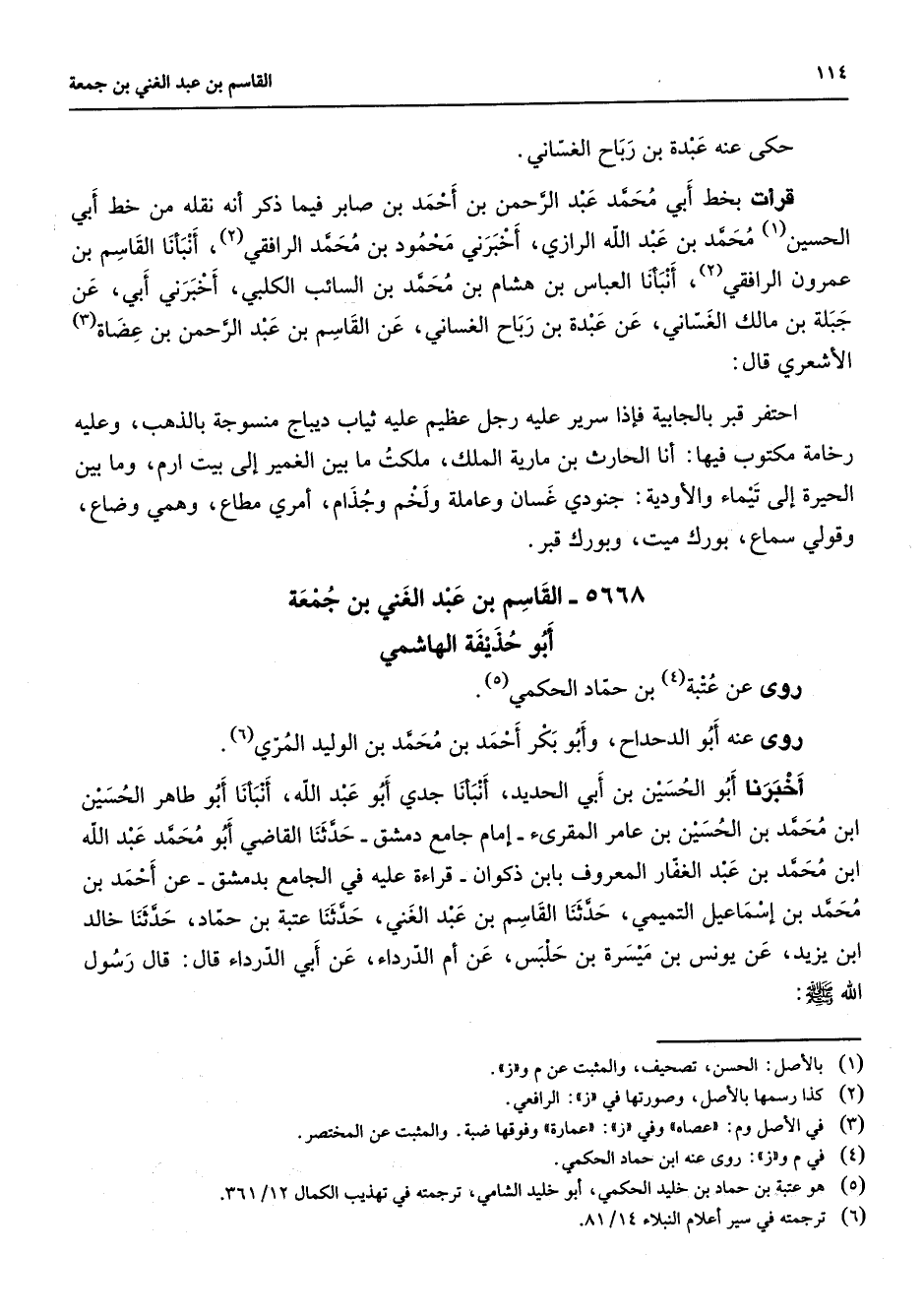 5668 - القاسم بن عبد الغني بن جمعة أبو حذيفة الهاشمي روى عنه عتبة (4) بن حماد الحكمي (5) روى عنه أبو الدحداح وأبو بكر أحمد بن محمد بن الوليد المري (6) أخبرنا أبو الحسين بن أبي الحديد أنبأنا جدي أبو عبد الله أنبأنا أبو طاهر الحسين ابن محمد بن الحسين بن عامر المقرئ إمام جامع دمشق حدثنا القاضي أبو محمد عبد الله ابن محمد بن عبد الغفار المعروف بابن ذكوان قراءة عليه في الجامع بدمشق عن أحمد بن محمد بن إسماعيل التميمي حدثنا القاسم بن عبد الغني حدثنا عتبة بن حماد حدثنا خالد ابن يزيد عن يونس بن ميسرة بن حلبس عن أم الدرداء عن أبي الدرداء قال قال رسول الله (صلى الله عليه وسلم)