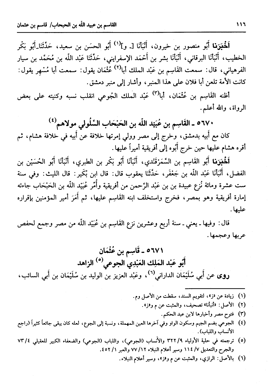 5671 - قاسم بن عثمان أبو عبد الملك العبدي الجوعي (5) الزاهد روى عن أبي سليمان الداراني (6) وعبد العزيز بن الوليد بن سليمان بن أبي السائب