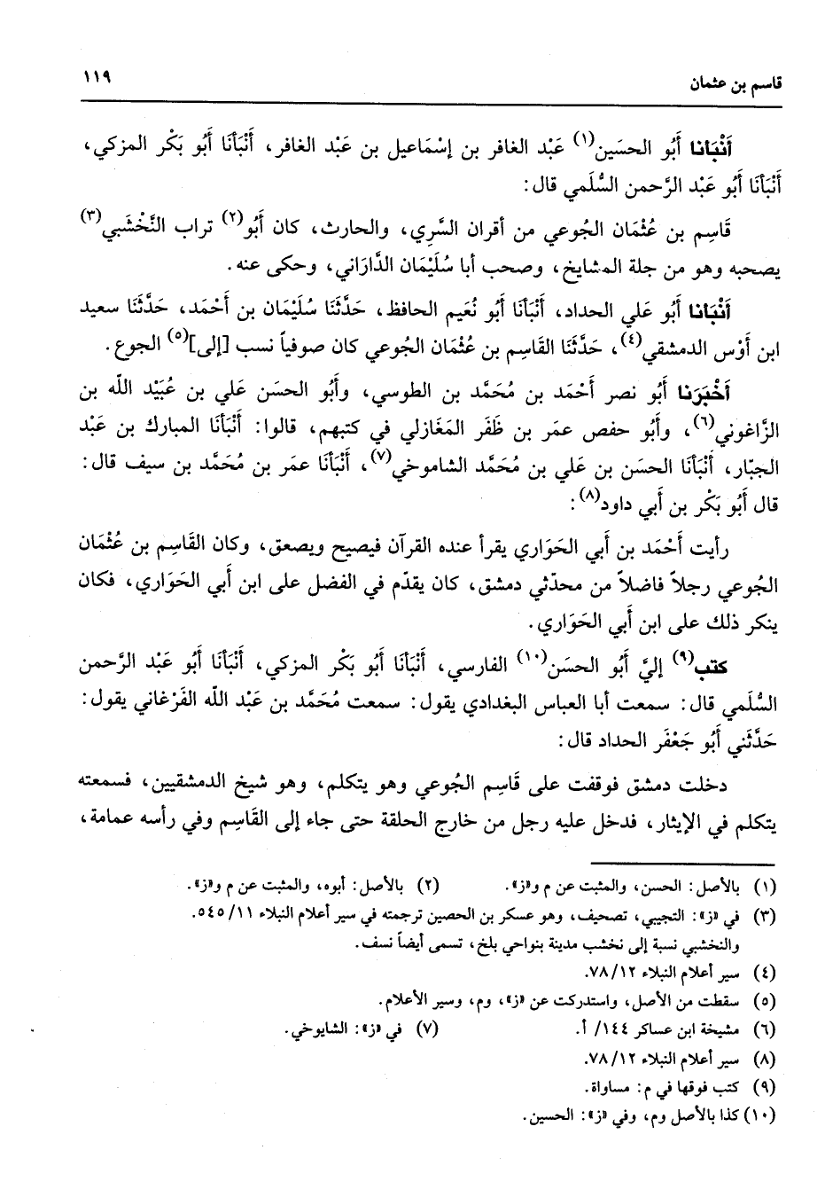 أنبأنا أبو الحسين (1) عبد الغافر بن إسماعيل بن عبد الغافر أنبأنا أبو بكر المزكي أنبأنا أبو عبد الرحمن السلمي قال قاسم بن عثمان الجوعي من أقران السري والحارث كان أبو (2) تراب النخشبي (3) يصحبه وهو من جلة المشايخ وصحب أبا سليمان الداراني وحكى عنه أنبأنا أبو علي الحداد أنبأنا أبو نعيم الحافظ حدثنا سليمان بن أحمد حدثنا سعيد ابن أوس الدمشقي (4) حدثنا القاسم بن عثمان الجوعي كان صوفيا نسب إلى (5) الجوع أخبرنا أبو نصر أحمد بن محمد بن الطوسي وأبو الحسن علي بن عبيد الله بن الزاغوني (6) وأبو حفص عمر بن ظفر المغازلي في كتبهم قالوا أنبأنا المبارك بن عبد الجبار أنبأنا الحسن بن علي بن محمد الشاموخي (7) أنبأنا عمر بن محمد بن سيف قال قال أبو بكر بن أبي داود (8) رأيت أحمد بن أبي الحواري يقرأ عنده القرآن فيصيح ويصعق وكان القاسم بن عثمان الجوعي رجلا فاضلا من محدثي دمشق كان يقدم في الفضل على ابن أبي الحواري فكان ينكر ذلك على ابن أبي الحواري كتب (9) إلي أبو الحسن (10) الفارسي أنبأنا أبو بكر المزكي أنبأنا أبو عبد الرحمن السلمي قال سمعت أبا العباس البغدادي يقول سمعت محمد بن عبد الله الفرغاني يقول حدثني أبو جعفر الحداد قال دخلت دمشق فوقفت على قاسم الجوعي وهو يتكلم وهو شيخ الدمشقيين فسمعته يتكلم في الإيثار فدخل عليه رجل من خارج الحلقة حتى جاء إلى القاسم وفي رأسه عمامة