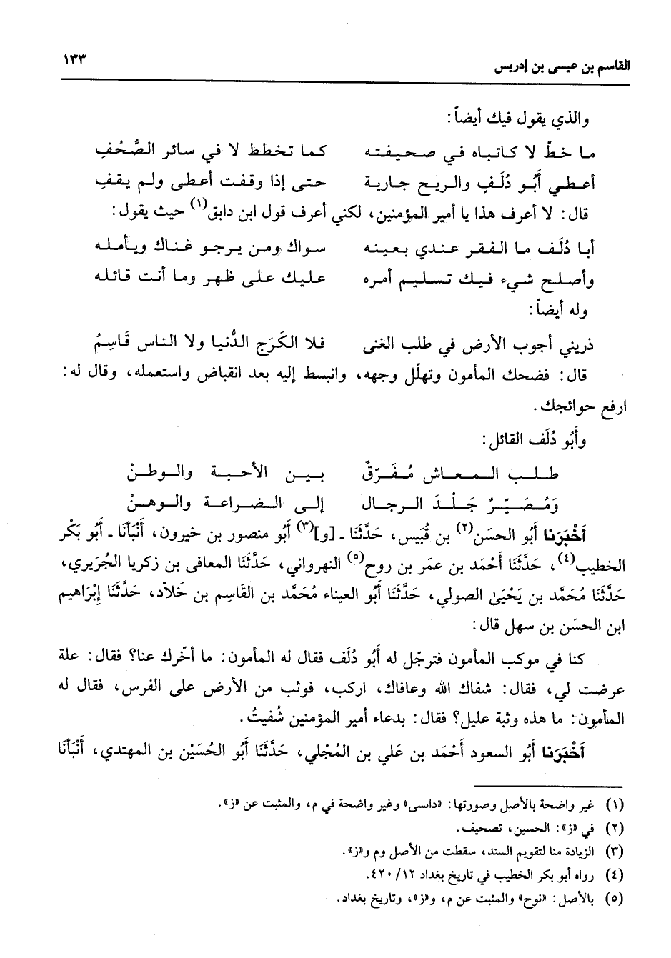 والذي يقول فيك أيضا * ما خط لا كاتباه في صحيفته * كما تخطط لا في سائر الصحف أعطي أبو دلف والريح جارية * حتى إذا وقفت أعطى ولم يقف * قال لا أعرف هذا يا امير المؤمنين لكني أعرف قول ابن دابق (1) حيث يقول * أبا دلف ما الفقر عندي بعينه * سواك ومن يرجو غناك ويأمله وأصلح شئ فيك تسليم أمره * عليك على ظهر وما أنت قائله * وله أيضا * ذريني أجوب الأرض في طلب الغنى * فلا الكرج الدنيا ولا الناس قاسم * قال فضحك المأمون وتهلل وجهه وانبسط إليه بعد انقباض واستعمله وقال له ارفع حوائجك وأبو دلف القائل * طلب المعاش مفرق * بين الأحبة والوطن ومصير جلد الرجال * إلى الضراعة والوهن * أخبرنا أبو الحسن (2) بن قبيس حدثنا و (3) أبو منصور بن خيرون أنبأنا أبو بكر الخطيب (4) حدثنا أحمد بن عمر بن روح (5) النهرواني حدثنا المعافى بن زكريا الجريري حدثنا محمد بن يحيى الصولي حدثنا أبو العيناء محمد بن القاسم بن خلاد حدثنا إبراهيم ابن الحسن بن سهل قال كنا في موكب المأمون فترجل له أبو دلف فقال له المأمون ما أخرك عنا فقال علة عرضت لي فقال شفاك الله وعافاك اركب فوثب من الأرض على الفرس فقال له المأمون ما هذه وثبة عليل فقال بدعاء أمير المؤمنين شفيت أخبرنا أبو السعود أحمد بن علي بن المجلي حدثنا أبو الحسين بن المهتدي أنبأنا