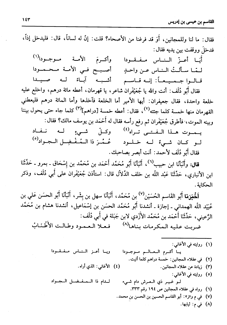 (5) روايته في الاغاني: لو غير ذي العرش دام شئ لدام ذا المفضل الجواد (6) رواه في عقلاء المجانين ص 194 رقم 333
