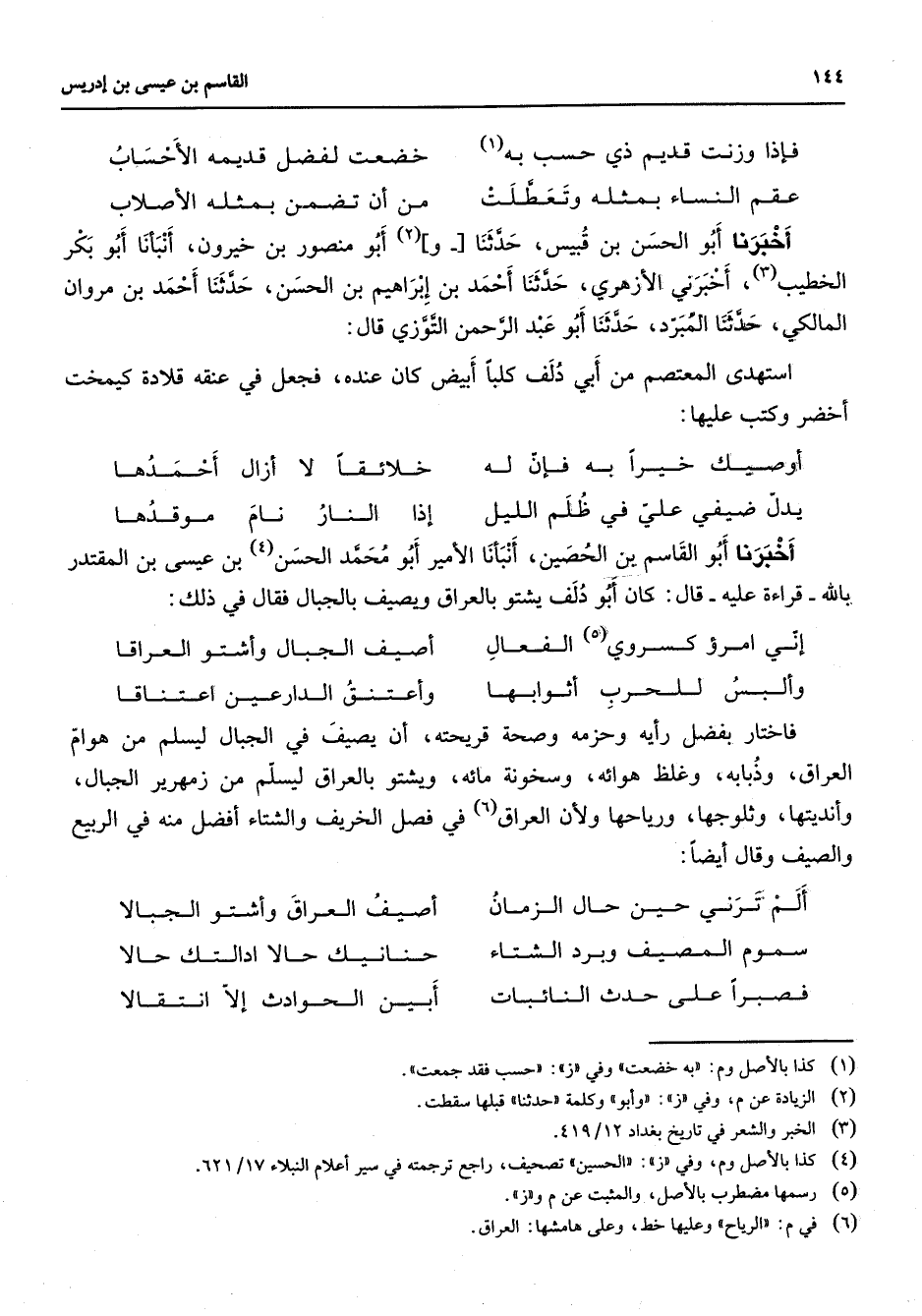 فإذا وزنت قديم ذي حسب به (1) * خضعت لفضل قديمه الأحساب عقم النساء بمثله وتعطلت * من أن تضمن بمثله الأصلاب * أخبرنا أبو الحسن بن قبيس حدثنا و (2) أبو منصور بن خيرون أنبأنا أبو بكر الخطيب (3) أخبرني الأزهري حدثنا أحمد بن إبراهيم بن الحسن حدثنا أحمد بن مروان المالكي حدثنا المبرد حدثنا أبو عبد الرحمن التوزي قال استهدى المعتصم من أبي دلف كلبا أبيض كان عنده فجعل في عنقه قلادة كيمخت أخضر وكتب عليها * أوصيك خيرا به فإن له * خلائقا لا أزال أحمدها يدل ضيفي علي في ظلم الليل * إذا النار نام موقدها * اخبرنا أبو القاسم بن الحصين أنبأنا الأمير أبو محمد الحسن (4) بن عيسى بن المقتدر بالله قراءة عليه قال كان أبو دلف يشتو بالعراق ويصيف بالجبال فقال في ذلك * إني امرؤ كسروي (5) الفعال * أصيف الجبال وأشتو العراقا وألبس للحرب أثوابها * وأعتنق الدارعين اعتناقا * فاختار بفضل رأيه وحزمه وصحة قريحته أن يصيف في الجبال ليسلم من هوام العراق وذبابه وغلظ هوائه وسخونة مائة ويشتو بالعراق ليسلم من زمهرير الجبال وأنديتها وثلوجها ورياحها ولأن العراق (6) في فصل الخريف والشتاء أفضل منه في الربيع والصيف وقال أيضا * ألم ترني حين حال الزمان * أصيف العراق وأشتو الجبالا سموم المصيف وبرد الشتاء * حنانيك حالا ادالتك حالا * فصبرا على حدث النائبات * أبين الحوادث إلا انتقالا *