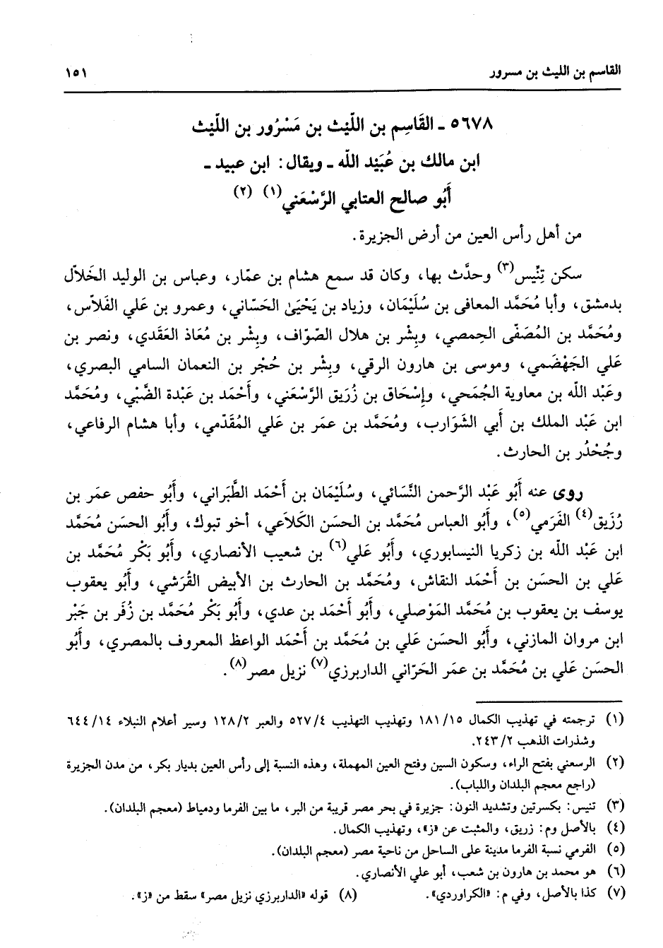 5678 - القاسم بن الليث بن مسرور بن الليث ابن مالك بن عبيد الله ويقال ابن عبيد أبو صالح العتابي الرسعني (1) (2) من أهل رأس العين من أرض الجزيرة سكن تنيس (3) وحدث بها وكان قد سمع هشام بن عمار وعباس بن الوليد الخلال بدمشق وأبا محمد المعافى بن سليمان وزياد بن يحيى الحساني وعمرو بن علي الفلاس ومحمد بن المصفى الحمصي وبشر بن هلال الصواف وبشر بن معاذ العقدي ونصر بن علي الجهضمي وموسى بن هارون الرقي وبشر بن حجر بن النعمان السامي البصري وعبد الله بن معاوية الجمحي وإسحاق بن زريق الرسعني وأحمد بن عبدة الضبي ومحمد ابن عبد الملك بن أبي الشوارب ومحمد بن عمر بن علي المقدمي وأبا هشام الرفاعي وجحدر بن الحارث روى عنه أبو عبد الرحمن النسائي وسليمان بن أحمد الطبراني وأبو حفص عمر بن رزيق (4) الفرمي (5) وأبو العباس محمد بن الحسن الكلاعي أخو تبوك وأبو الحسن محمد ابن عبد الله بن زكريا النيسابوري وأبو علي (6) بن شعيب الأنصاري وأبو بكر محمد بن علي بن الحسن بن أحمد النقاش ومحمد بن الحارث بن الأبيض القرشي وأبو يعقوب يوسف بن يعقوب بن محمد الموصلي وأبو أحمد بن عدي وأبو بكر محمد بن زفر بن جبر ابن مروان المازني وأبو الحسن علي بن محمد بن أحمد الواعظ المعروف بالمصري وأبو الحسن علي بن محمد بن عمر الحراني الداربرزي (7) نزيل مصر (8)
