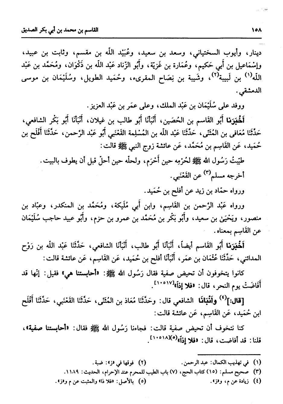 دينار وأيوب السختياني وسعد بن سعيد وعبيد الله بن مقسم وثابت بن عبيد وإسماعيل بن أبي حكيم وعمارة بن غزية وأبو الزناد عبد الله بن ذكوان ومحمد بن عبد الله (1) بن لبيبة (2) وشيبة بن نصاح المقرئ وحميد الطويل وسليمان بن موسى الدمشقي ووفد على سليمان بن عبد الملك وعلى عمر بن عبد العزيز أخبرنا أبو القاسم بن الحصين أنبأنا أبو طالب بن غيلان أنبأنا أبو بكر الشافعي حدثنا معافى بن المثنى حدثنا عبد الله بن المسلمة القعنبي أبو عبد الرحمن حدثنا أفلح بن حميد عن القاسم بن محمد عن عائشة زوج النبي (صلى الله عليه وسلم) قالت طيبت رسول الله (صلى الله عليه وسلم) لحرمه حين أحرم ولحله حين أحل قبل أن يطوف بالبيت أخرجه مسلم (3) عن القعنبي ورواه حماد بن زيد عن أفلح بن حميد ورواه عبد الرحمن بن القاسم وابن أبي مليكة ومحمد بن المنكدر وعباد بن منصور ويحيى بن سعيد وأبو بكر بن محمد بن عمرو بن حزم وأبو عبيد حاجب سليمان عن القاسم بمعناه أخبرنا أبو القاسم أيضا أنبأنا أبو طالب أنبأنا الشافعي حدثنا عبد الله بن روح المدائني حدثنا عثمان بن عمر أنبأنا أفلح بن حميد عن القاسم عن عائشة قالت كانوا يتخوفون أن تحيض صفية فقال رسول الله (صلى الله عليه وسلم) أحابستنا هي فقيل إنها قد أفاضت يوم النحر قال فلا إذا