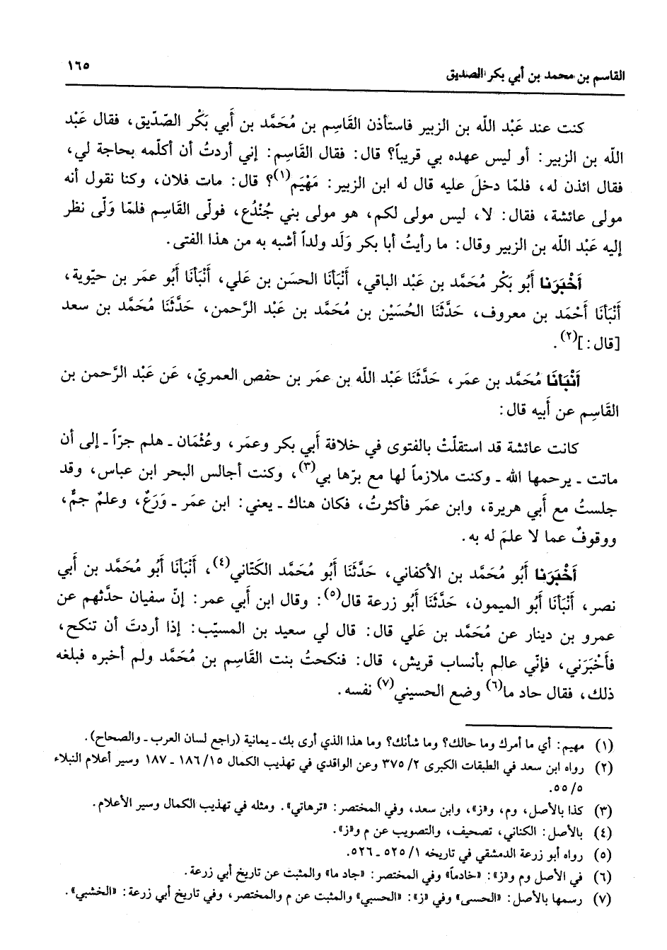 كنت عند عبد الله بن الزبير فاستأذن القاسم بن محمد بن أبي بكر الصديق فقال عبد الله بن الزبير أو ليس عهده بي قريبا قال فقال القاسم إني أردت أن أكلمه بحاجة لي فقال ائذن له فلما دخل عليه قال له ابن الزبير مهيم (1) قال مات فلان وكنا نقول أنه مولى عائشة فقال لا ليس مولى لكم هو مولى بني جندع فولى القاسم فلما ولى نظر إليه عبد الله بن الزبير وقال ما رأيت أبا بكر ولد ولدا أشبه به من هذا الفتى أخبرنا أبو بكر محمد بن عبد الباقي أنبأنا الحسن بن علي أنبأنا أبو عمر بن حيوية أنبأنا أحمد بن معروف حدثنا الحسين بن محمد بن عبد الرحمن حدثنا محمد بن سعد قال (2) أنبأنا محمد بن عمر حدثنا عبد الله بن عمر بن حفص العمري عن عبد الرحمن بن القاسم عن أبيه قال كانت عائشة قد استقلت بالفتوى في خلافة أبي بكر وعمر وعثمان هلم جرا إلى أن ماتت يرحمها الله وكنت ملازما لها مع برها بي (3) وكنت أجالس البحر ابن عباس وقد جلست مع أبي هريرة وابن عمر فأكثرت فكان هناك يعني ابن عمر ورع وعلم جم ووقوف عما لا علم له به أخبرنا أبو محمد بن الأكفاني حدثنا أبو محمد الكتاني (4) أنبأنا أبو محمد بن أبي نصر أنبأنا أبو الميمون حدثنا أبو زرعة قال (5) وقال ابن أبي عمر إن سفيان حدثهم عن عمرو بن دينار عن محمد بن علي قال قال لي سعيد بن المسيب إذا أردت أن تنكح فأخبرني فإني عالم بأنساب قريش قال فنكحت بنت القاسم بن محمد ولم أخبره فبلغه ذلك فقال حاد ما (6) وضع الحسيني (7) نفسه