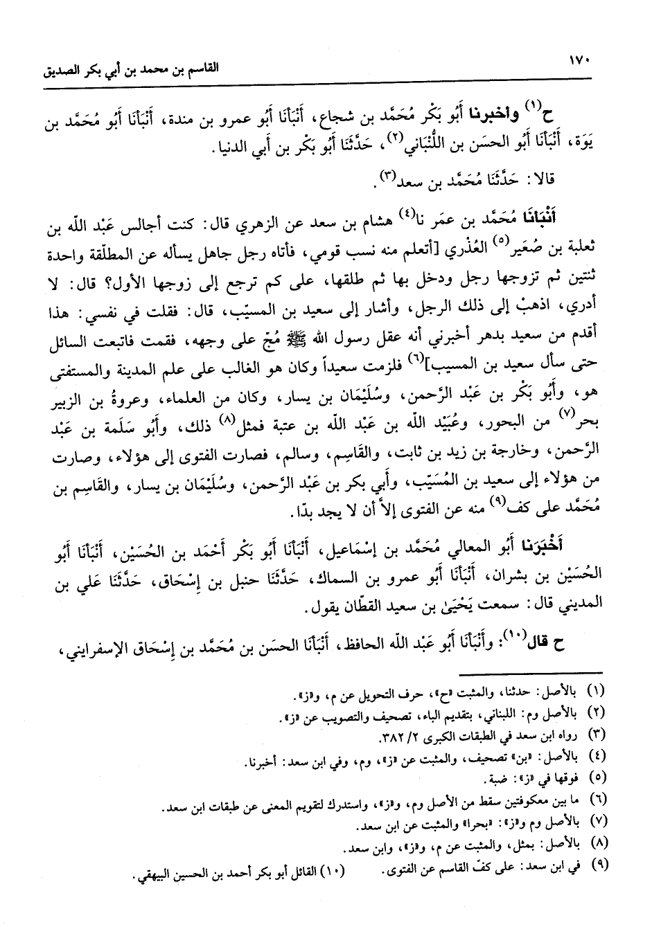 (1) وأخبرنا أبو بكر محمد بن شجاع أنبأنا أبو عمرو بن مندة أنبأنا أبو محمد بن يوة أنبأنا أبو الحسن بن اللنباني (2) حدثنا أبو بكر بن أبي الدنيا قالا حدثنا محمد بن سعد (3) أنبأنا محمد بن عمر نا (4) هشام بن سعد عن الزهري قال كنت أجالس عبد الله بن ثعلبة بن صعير (5) العذري أتعلم منه نسب قومي فأتاه رجل جاهل يسأله عن المطلقة واحدة ثنتين ثم تزوجها رجل ودخل بها ثم طلقها على كم ترجع إلى زوجها الأول قال لا أدري اذهب إلى ذلك الرجل وأشار إلى سعيد بن المسيب قال فقلت في نفسي هذا أقدم من سعيد بدهر أخبرني أنه عقل رسول الله (صلى الله عليه وسلم) مج على وجهه فقمت فاتبعت السائل حتى سأل سعيد بن المسيب (6) فلزمت سعيدا وكان هو الغالب على علم المدينة والمستفتي هو وأبو بكر بن عبد الرحمن وسليمان بن يسار وكان من العلماء وعروة بن الزبير بحر (7) من البحور وعبيد الله بن عبد الله بن عتبة فمثل (8) ذلك وأبو سلمة بن عبد الرحمن وخارجة بن زيد بن ثابت والقاسم وسالم فصارت الفتوى إلى هؤلاء وصارت من هؤلاء إلى سعيد بن المسيب وأبي بكر بن عبد الرحمن وسليمان بن يسار والقاسم بن محمد على كف (9) منه عن الفتوى إلا أن لا يجد بدا أخبرنا أبو المعالي محمد بن إسماعيل أنبأنا أبو بكر أحمد بن الحسين أنبأنا أبو الحسين بن بشران أنبأنا أبو عمرو بن السماك حدثنا حنبل بن إسحاق حدثنا علي بن المديني قال سمعت يحيى بن سعيد القطان يقول قال (10) وأنبأنا أبو عبد الله الحافظ أنبأنا الحسن بن محمد بن إسحاق الإسفرايني