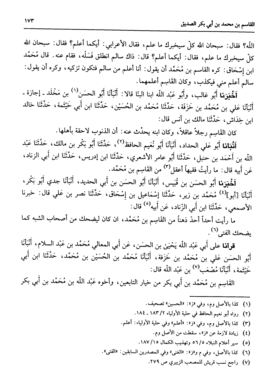 الله فقال سبحان الله كل سيخبرك ما علم فقال الأعرابي أيكما أعلم فقال سبحان الله كل سيخبرك ما علم فقال أيكما أعلم قال ذاك سالم انطلق فسله فقام عنه قال محمد ابن إسحاق كره القاسم بن محمد أن يقول أنا أعلم من سالم فتكون تزكيه وكره أن يقول سالم أعلم مني فيكذب وكان القاسم أعلمهما أخبرنا أبو غالب وأبو عبد الله ابنا البنا قالا أنبأنا أبو الحسن بن مخلد إجازة أنبأنا علي بن محمد بن خزفة حدثنا محمد بن الحسين حدثنا ابن أبي خيثمة حدثنا خالد ابن خداش حدثنا مالك بن أنس قال كان القاسم رجلا عاقلا وكان ابنه يحدث عنه أن الذنوب لاحقة بأهلها أنبأنا أبو علي الحداد أنبأنا أبو نعيم الحافظ (2) حدثنا أبو بكر بن مالك حدثنا عبد الله بن أحمد بن حنبل حدثنا أبو عامر الأشعري حدثنا ابن إدريس حدثنا ابن أبي الزناد عن أبيه قال ما رأيت فقيها أعقل (3) من القاسم بن محمد أخبرنا أبو الحسن بن قبيس أنبأنا أبو الحسن بن أبي الحديد أنبأنا جدي أبو بكر أنبأنا أبو (4) محمد بن زير حدثنا إسماعيل بن إسحاق حدثنا نصر بن علي قال خبرنا الأصمعي حدثنا ابن أبي الزناد عن أبيه (5) قال ما رأيت أحدا أحد ذهنا من القاسم بن محمد ان كان ليضحك من أصحاب الشبه كما يضحك الفتى (6) قرأنا على أبي عبد الله يحيى بن الحسن عن أبي المعالي محمد بن عبد السلام أنبأنا أبو الحسن علي بن محمد بن خزفة أنبأنا محمد بن الحسين بن محمد حدثنا ابن أبي خيثمة أنبأنا مصعب (7) بن عبد الله قال القاسم بن محمد بن أبي بكر من خيار التابعين وأخوه عبد الله بن محمد بن أبي بكر