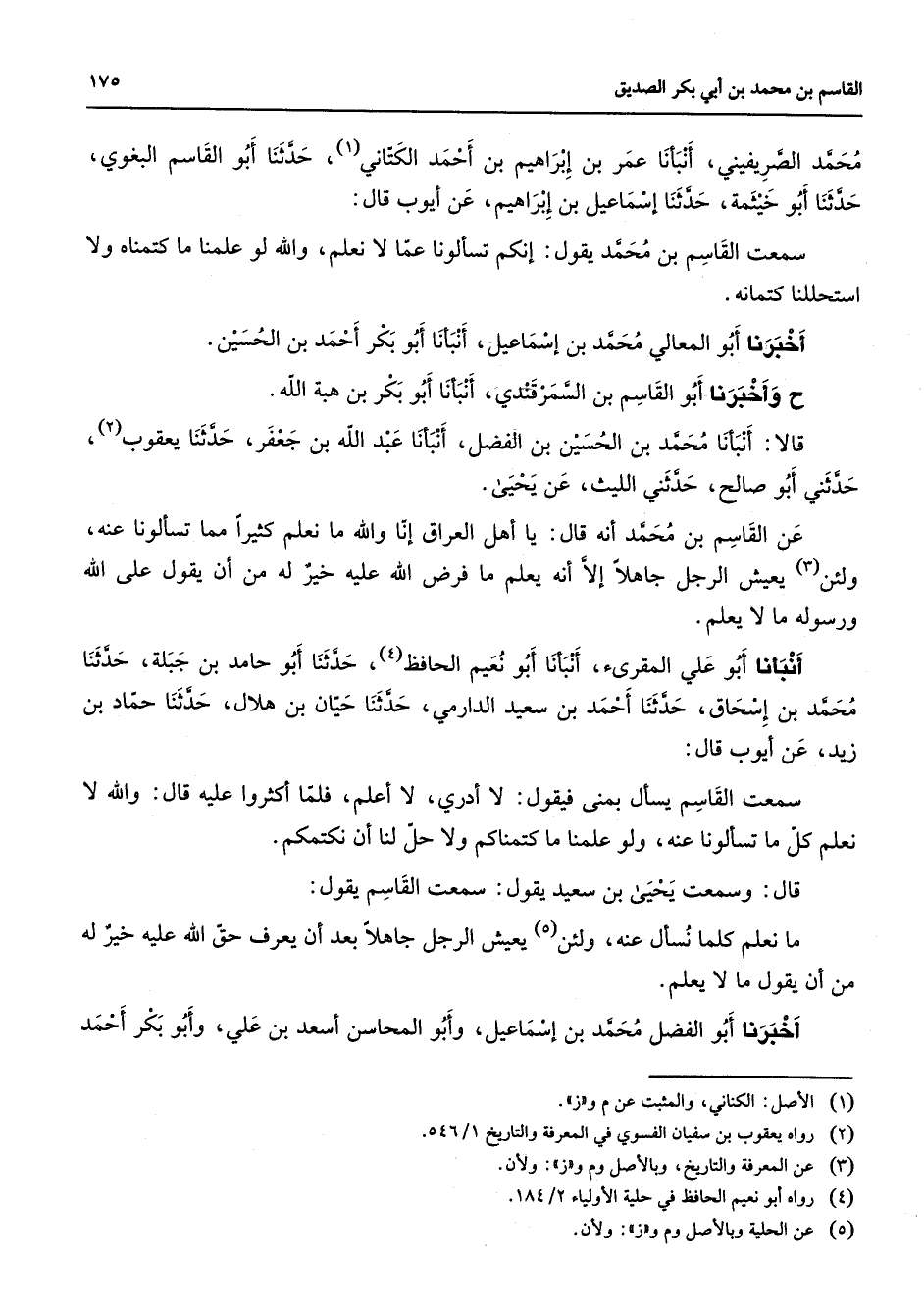 محمد الصريفيني أنبأنا عمر بن إبراهيم بن أحمد الكتاني (1) حدثنا أبو القاسم البغوي حدثنا أبو خيثمة حدثنا إسماعيل بن إبراهيم عن أيوب قال سمعت القاسم بن محمد يقول إنكم تسألونا عما لا نعلم والله لو علمنا ما كتمناه ولا استحللنا كتمانه أخبرنا أبو المعالي محمد بن إسماعيل أنبأنا أبو بكر أحمد بن الحسين وأخبرنا أبو القاسم بن السمرقندي أنبأنا أبو بكر بن هبة الله قالا أنبأنا محمد بن الحسين بن الفضل أنبأنا عبد الله بن جعفر حدثنا يعقوب (2) حدثني أبو صالح حدثني الليث عن يحيى عن القاسم بن محمد أنه قال يا أهل العراق إنا والله ما نعلم كثيرا مما تسألونا عنه ولئن (2) يعيش الرجل جاهلا إلا أنه يعلم ما فرض الله عليه خير له من أن يقول على الله ورسوله مالا يعلم أنبأنا أبو علي المقرئ أنبأنا أبو نعيم الحافظ (4) حدثنا أبو حامد بن جبلة حدثنا محمد بن إسحاق حدثنا أحمد بن سعيد الدارمي حدثنا حيان بن هلال حدثنا حماد بن زيد عن أيوب قال سمعت القاسم يسأل بمنى فيقول لا أدري لا أعلم فلما أكثروا عليه قال والله لا نعلم كل ما تسألونا عنه ولو علمنا ما كتمناكم ولا حل لنا أن نكتمكم قال وسمعت يحيى بن سعيد يقول سمعت القاسم يقول ما نعلم كلما نسأل عنه ولئن (5) يعيش الرجل جاهلا بعد أن يعرف حق الله عليه خير له من أن يقول ما لا يعلم أخبرنا أبو الفضل محمد بن إسماعيل وأبو المحاسن أسعد بن علي وأبو بكر أحمد