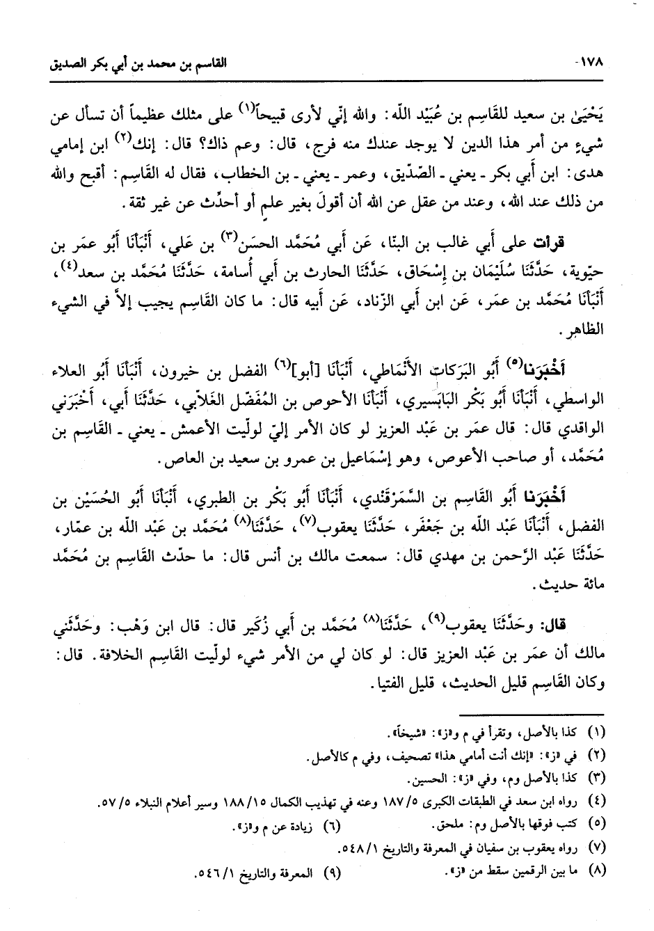 يحيى بن سعيد للقاسم بن عبيد الله والله إني لأرى قبيحا (1) على مثلك عظيما أن تسأل عن شئ من أمر هذا الدين لا يوجد عندك منه فرج قال وعم ذاك قال إنك (2) ابن إمامي هدى ابن أبي بكر يعني الصديق وعمر يعني بن الخطاب فقال له القاسم أقبح والله من ذلك عند الله وعند من عقل عن الله أن أقول بغير علم أو أحدث عن غير ثقة قرأت على أبي غالب بن البنا عن أبي محمد الحسن (3) بن علي أنبأنا أبو عمر بن حيوية حدثنا سليمان بن إسحاق حدثنا الحارث بن أبي أسامة حدثنا محمد بن سعد (4) أنبأنا محمد بن عمر عن ابن ابي الزناد عن أبيه قال ما كان القاسم يجيب إلى في الشئ الظاهر أخبرنا (5) أبو البركات الأنماطي أنبأنا أبو (6) الفضل بن خيرون أنبأنا أبو العلاء الواسطي أنبأنا أبو بكر البابسيري أنبأنا الأحوص بن المفضل الغلابي حدثنا أبي أخبرني الواقدي قال قال عمر بن عبد العزيز لو كان الأمر إلي لوليت الأعمش يعني القاسم بن محمد أو صاحب الأعوص وهو إسماعيل بن عمرو بن سعيد بن العاص أخبرنا أبو القاسم بن السمرقندي أنبأنا أبو بكر بن الطبري أنبأنا أبو الحسين بن الفضل أنبأنا عبد الله بن جعفر حدثنا يعقوب (7) حدثنا (8) محمد بن عبد الله بن عمار حدثنا عبد الرحمن بن مهدي قال سمعت مالك بن أنس قال ما حدث القاسم بن محمد مائة حديث قال وحدثنا يعقوب (9) حدثنا (8) محمد بن أبي زكير قال قال ابن وهب وحدثني مالك أن عمر بن عبد العزيز قال لو كان لي من الأمر شئ لوليت القاسم الخلافة قال وكان القاسم قليل الحديث قليل الفتيا